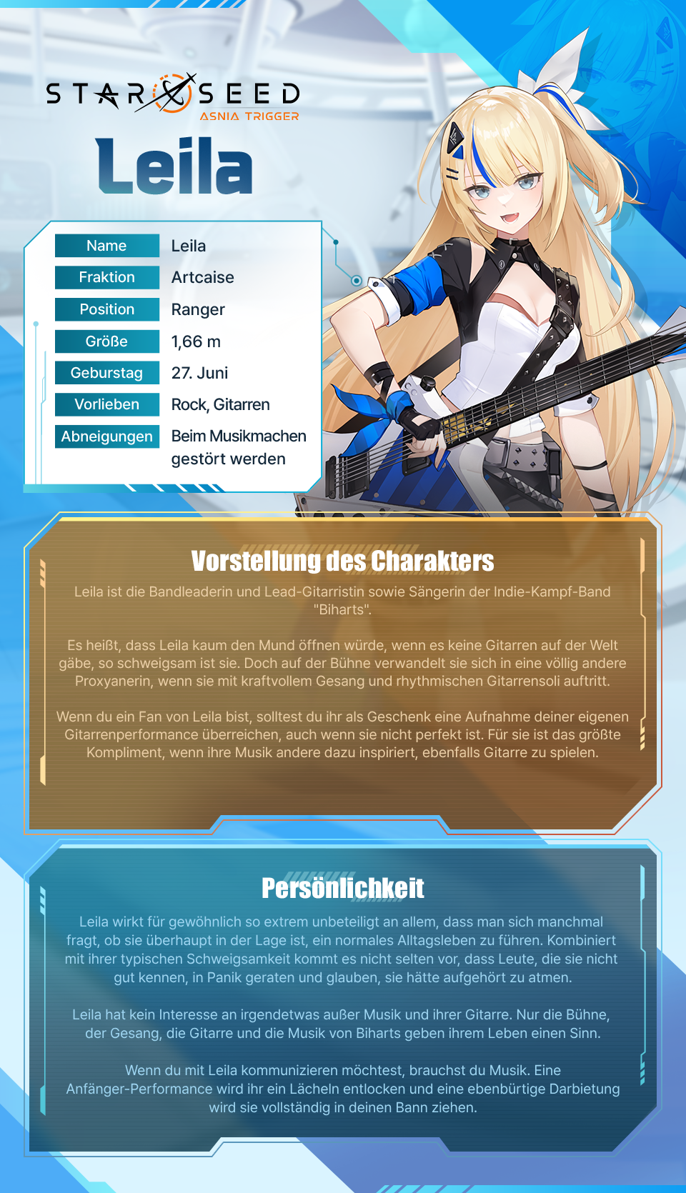 Leila ist voller Leidenschaft für Musik, zeigt jedoch Gleichgültigkeit gegenüber allem anderen. Weitere Details zu Leila findest du unten.