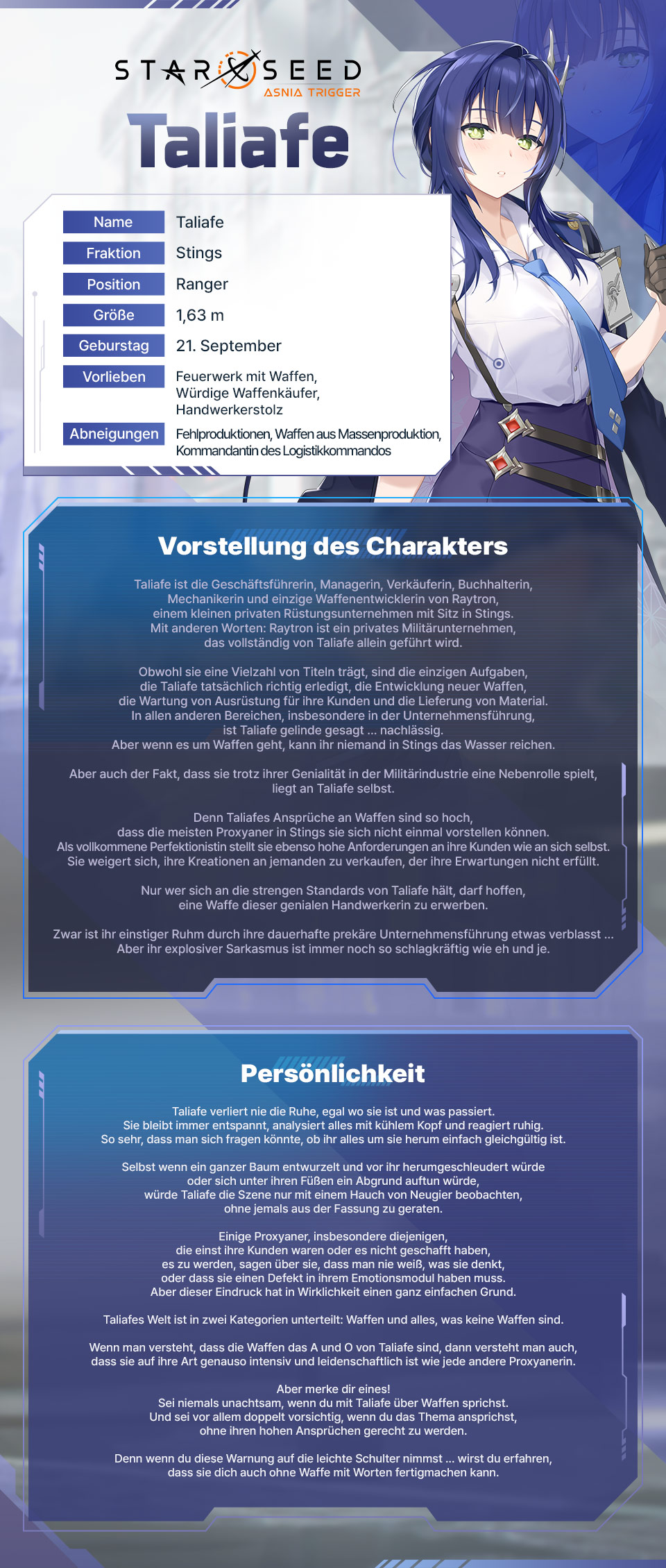 Heute stellen wir dir Taliafe vor. Sie ist eine geniale Handwerkerin aus Stings, die eine kleine Waffenfirma betreibt und ihre Waffen nur an Proxyaner verkauft, die es wert sind, sie zu besitzen.