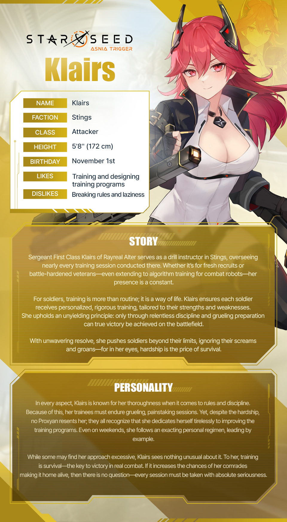 In today’s Get to Know Your Proxyan post, we’re visiting Klairs, Stings’ dedicated Drill Instructor from Rayreal Alter.