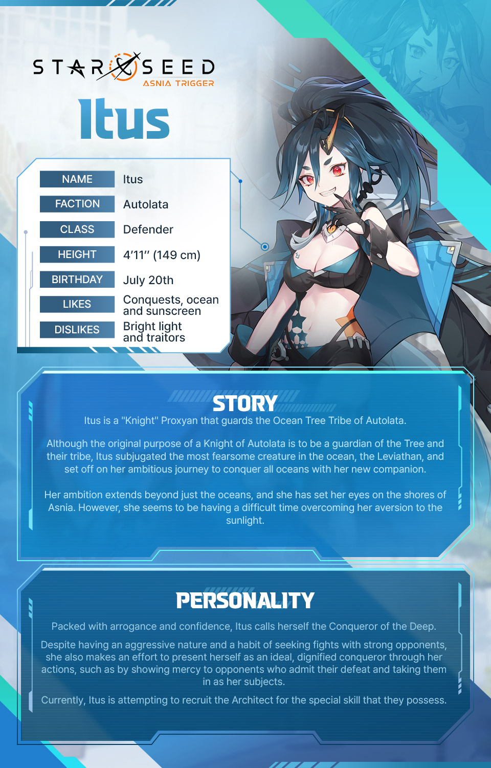 Originally, Autolatan knights vow to protect the Ocean Tree and their tribes, but not Itus. This ambitious Proxyan aims to subjugate the most ferocious creature in the ocean, Leviathan, and use it as her partner to conquer every sea.