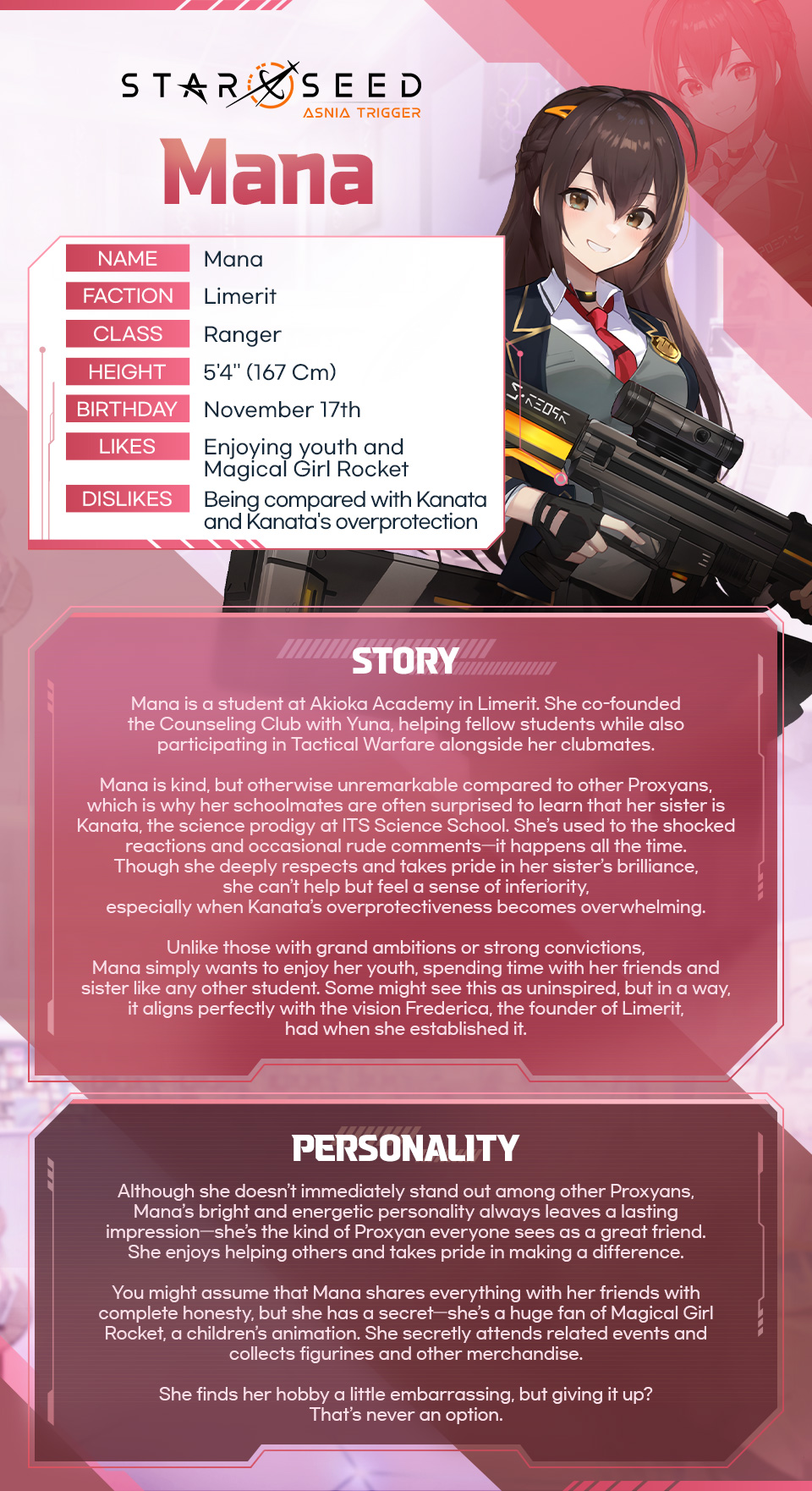 Unlike her sister Kanata, Mana may not stand out at first glance, but her warm and bubbly personality has a way of winning everyone over.