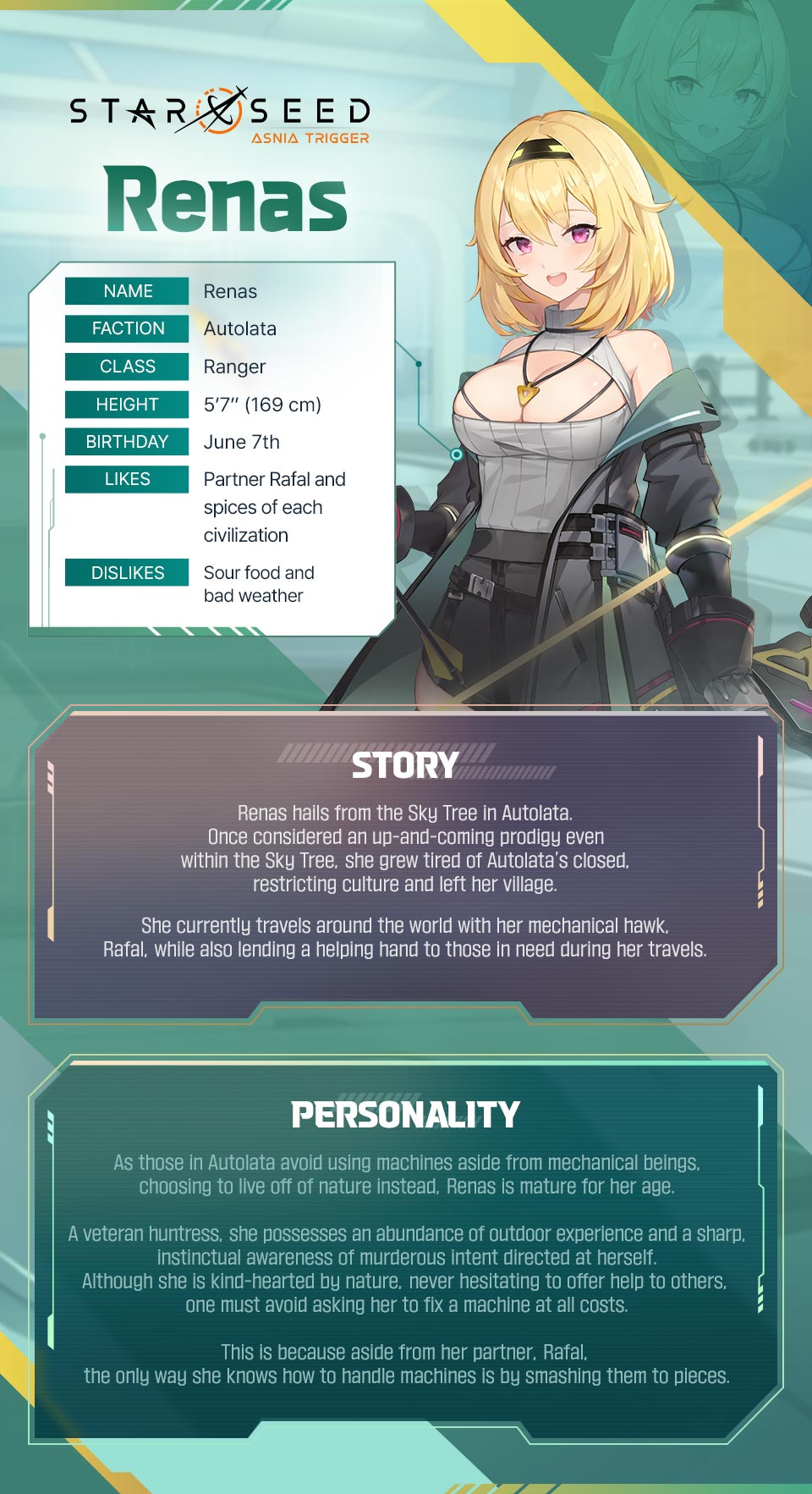 She used to be a prodigy in her home called the Sky Tree, but after growing tired of her tribe's closed culture, she decided to set off on a journey alongside her mechanical hawk, Rafal.