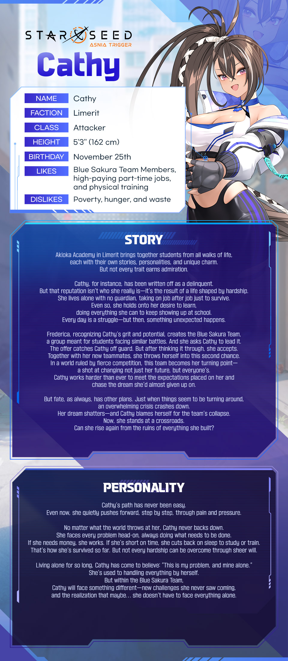 As the leader of the Blue Sakura Team, Cathy sees her teammates as more than just allies. To her, they're the reason she can keep going—the ones who help her forget how heavy life can feel.