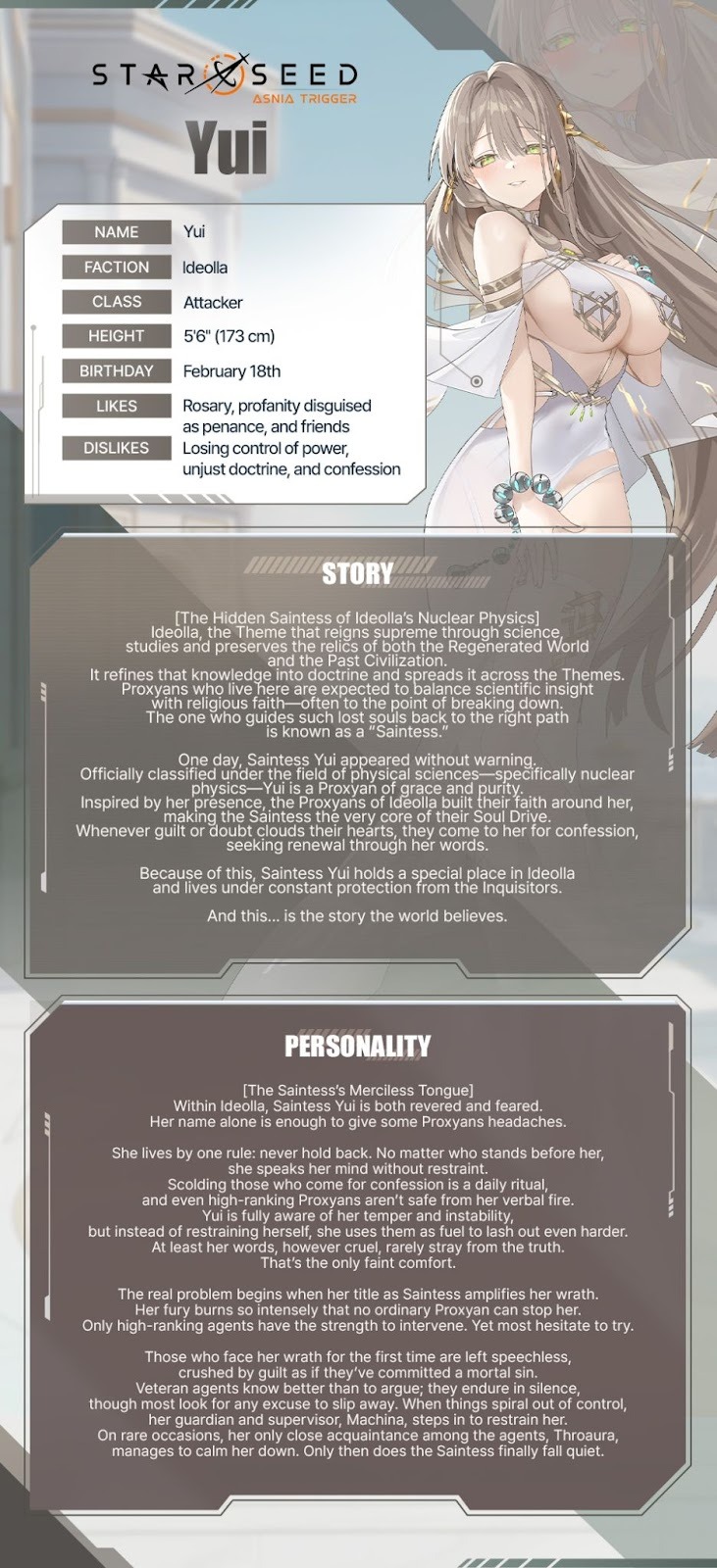 Yui is the Saintess of Ideolla who guides the Proxyans of Ideolla onto the right path.