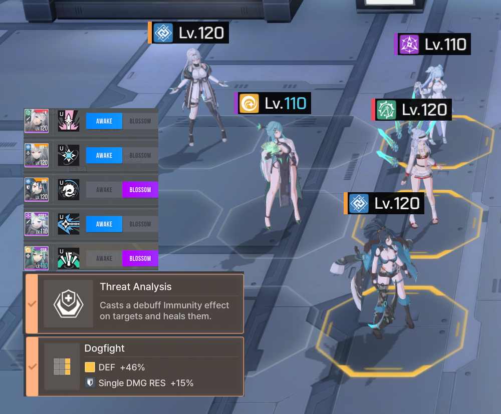 Dogfight Formation (+DEF +Single Target RES) is your general bread and butter when attempting to clear content when under leveled. Without it, later on, enemy DPS is high enough to wipe your team before anyone can get off an Ultimate. On certain AoE heavy battles, you may need to switch to Bunker Formation (+DEF +AOE RES), but otherwise this formation usually falls short of the Single Target RES which basic attacks also fall under.