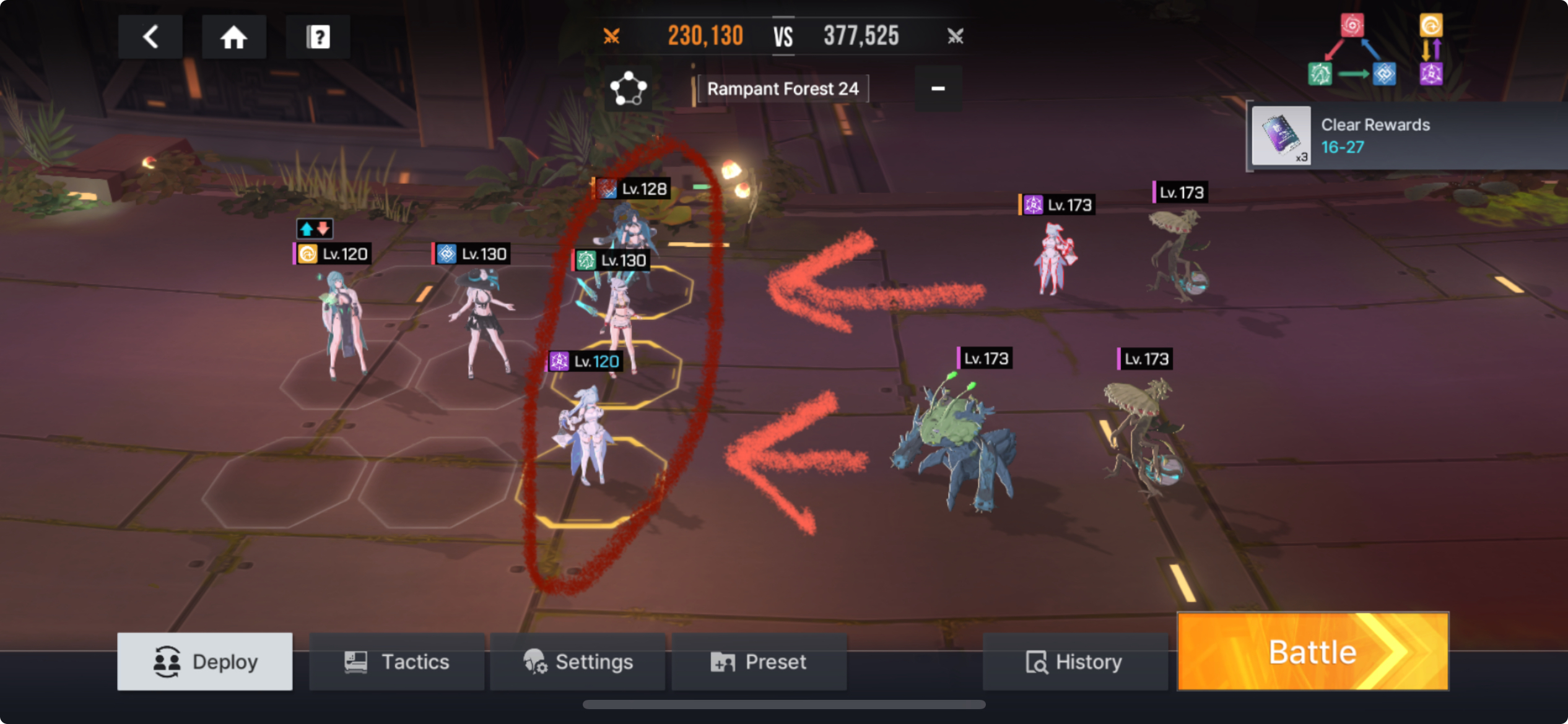 Placing your Attackers in the same row as the Defenders allows you to spread out the damage taken. This is very helpful when you are trying to beat stages that are higher level than you.