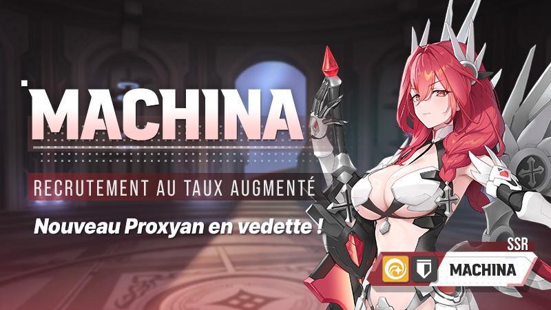 - Dans le recrutement au taux augmenté de Machina, un Proxyan SSR apparaît toutes les 30 tentatives de recrutement, mais le Proxyan au taux augmenté n'apparaît pas de manière garantie.