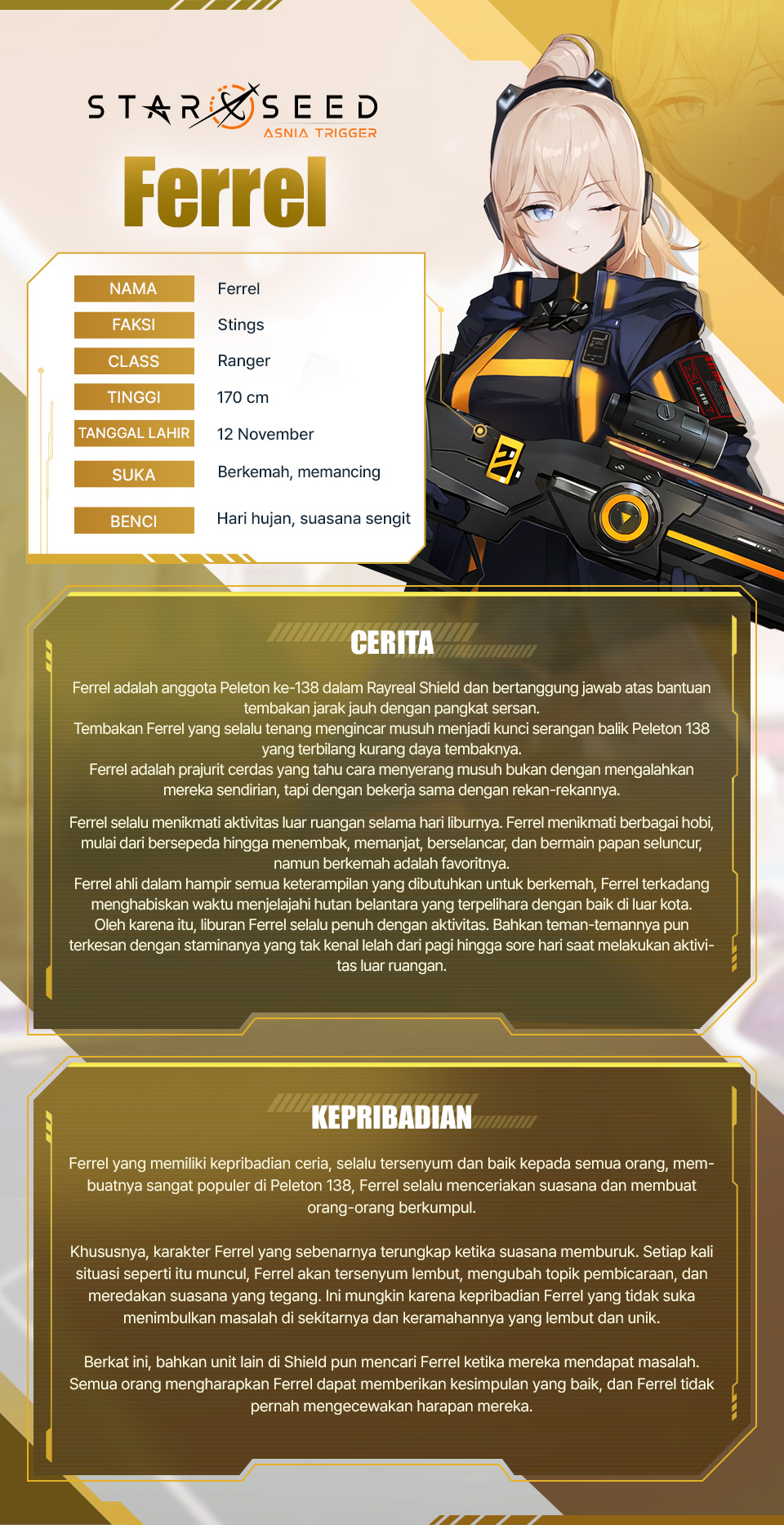 Kali ini kita akan bertemu dengan Ferrel, anggota Peleton ke-138 dalam Rayreal Shield di Stings.