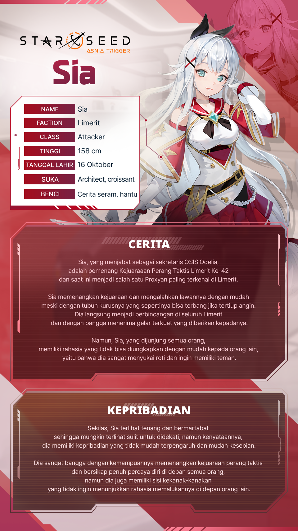 Sia, yang menjabat sebagai sekretaris OSIS Odelia, adalah pemenang Kejuaraaan Perang Taktis Limerit Ke-42