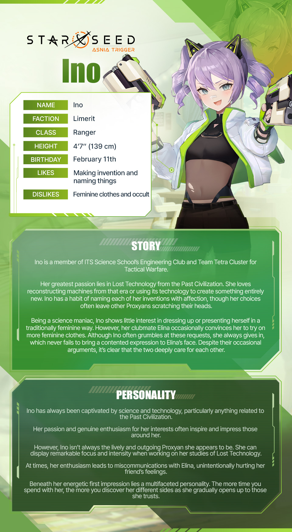 Ino is an inventive genius who creates new innovations by utilizing the technology of the Past Civilization.