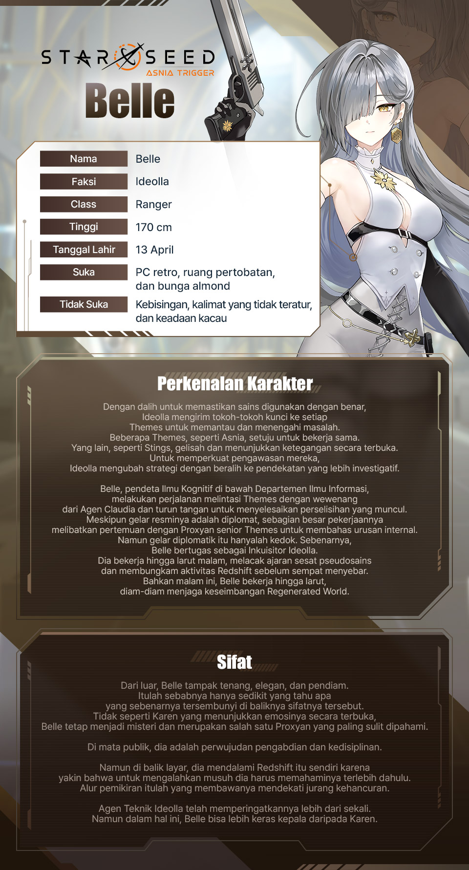 Namun, di balik sikap tenangnya itu, tersembunyi kenyataan bahwa peran Belle yang sebenarnya tidak lain adalah Inkuisitor Ideolla, yang bertugas menghukum mereka yang melanggar keutamaan ilmiah yang sakral itu.