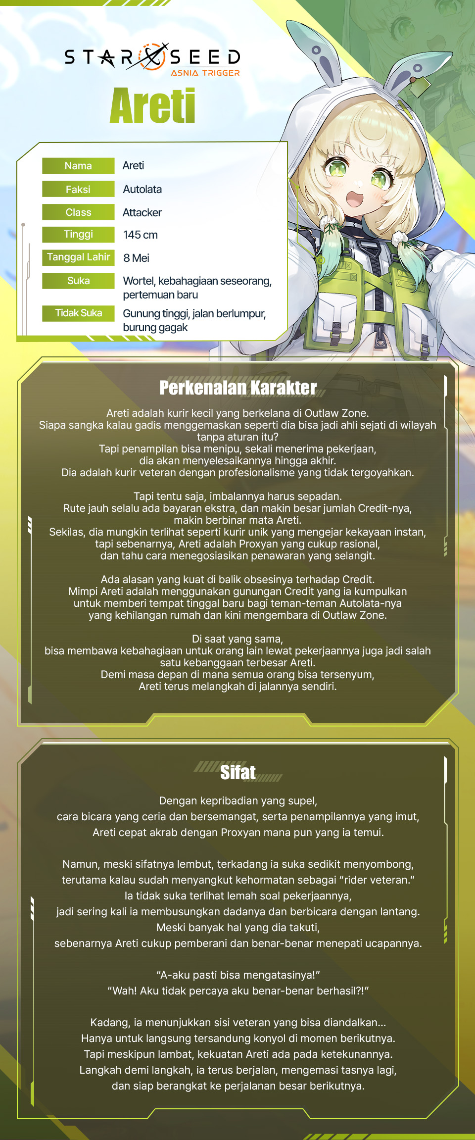 Sebagai kurir veteran, Areti selalu bertanggung jawab penuh atas setiap pengiriman dan dapat diandalkan, tetapi terkadang juga bisa menunjukkan sisi konyolnya.
