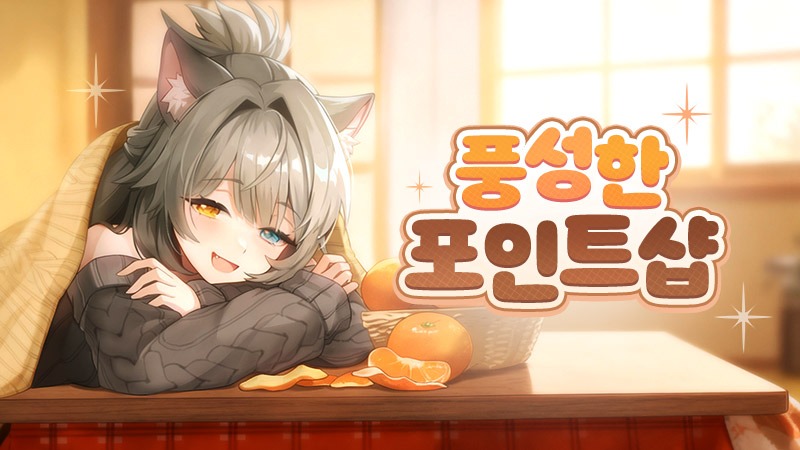 특정 패키지 구매 시 이벤트 재화(귤)를 획득하고, 이벤트 재화를 사용하여 추가로 다양한 아이템을 구매할 수 있는 [풍성한 포인트샵]이 오픈됩니다!