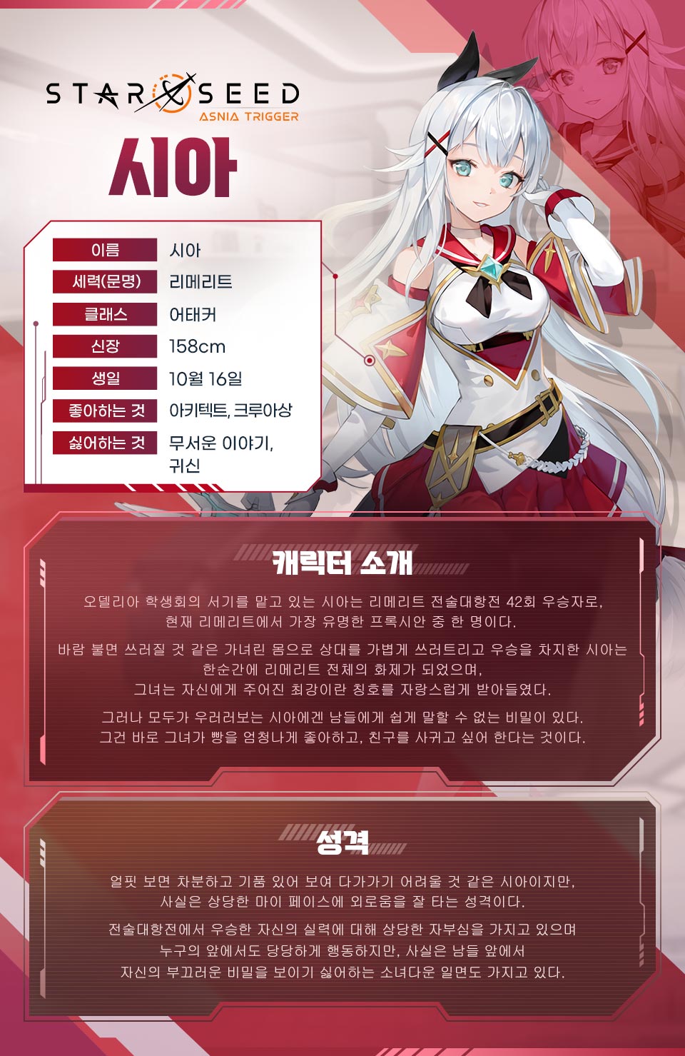오늘은 리메리트 소속의 학생회 서기인 시아에 대해 소개해드릴게요.