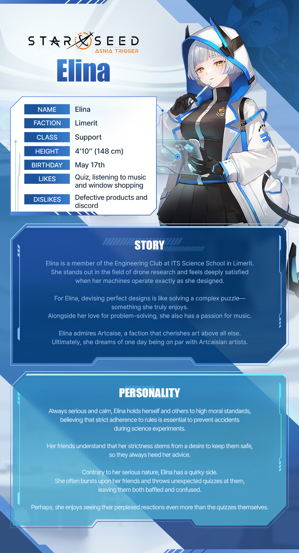 오늘은 리메리트 소속의 엄격한 공학부원인 엘리나를 소개해드릴게요.