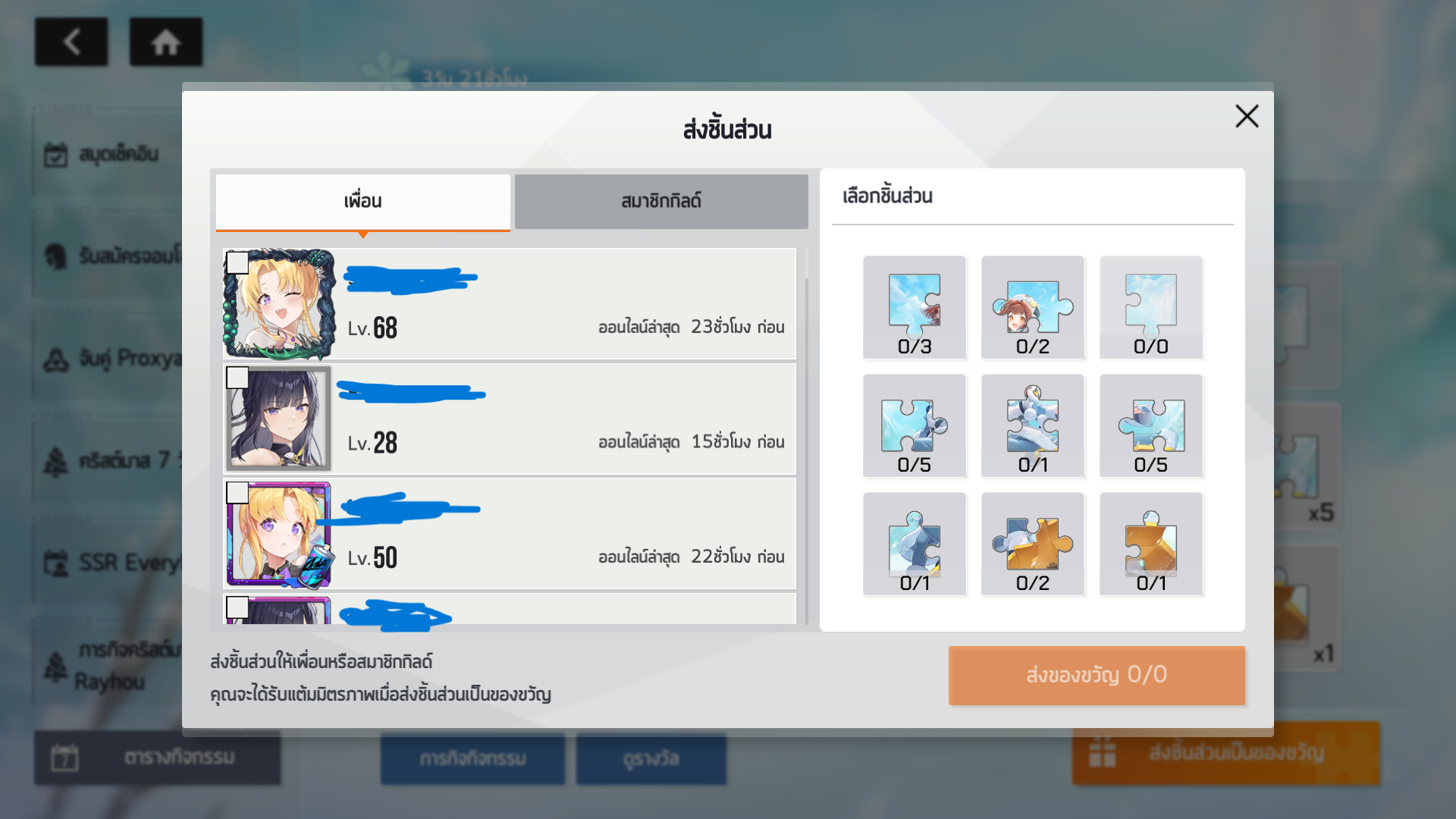 ถ้าเล่นกิจกรรมครบหมดแล้วสามารถส่งชิ้นส่วนให้คนอื่นเพื่อได้รับแต้มเพื่อน สามารถส่งให้คนอื่นได้3ชิ้นต่อวันได้30แต้ม