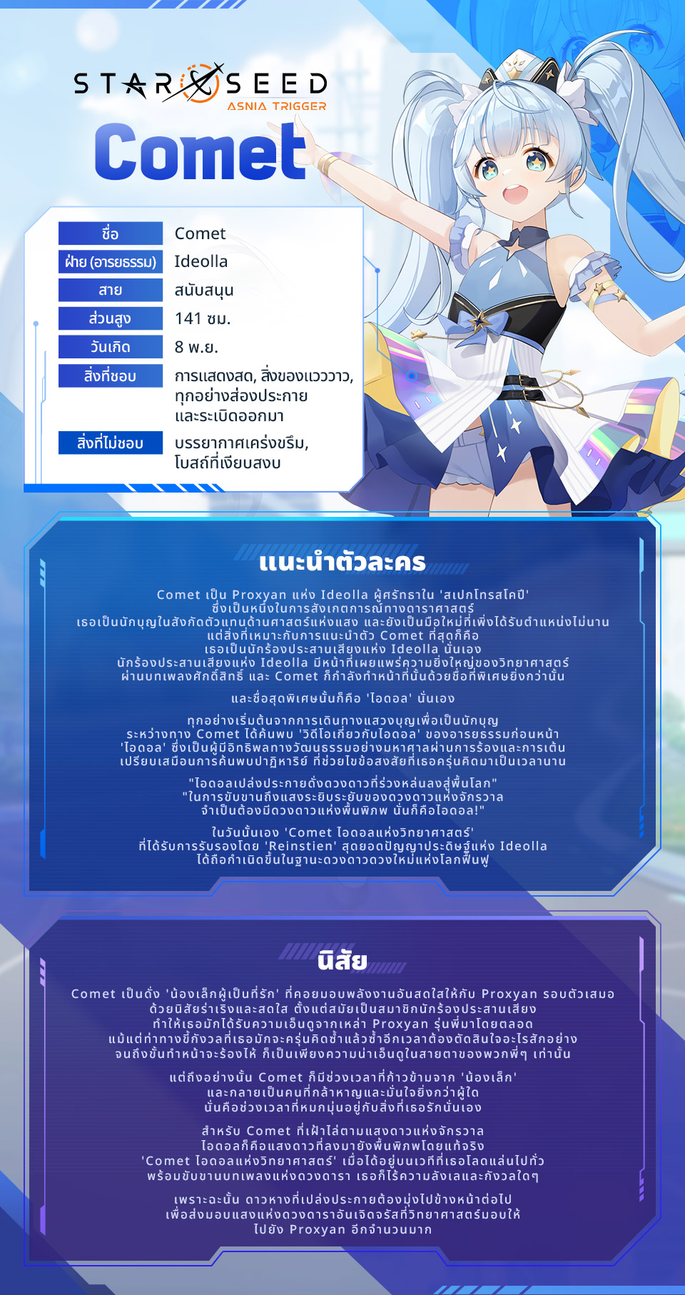 Comet เป็นไอดอลที่ได้รับความรักและเป็นเหมือนน้องเล็กที่คอยกระจายพลังให้กับ Proxyan รอบๆ ตัว