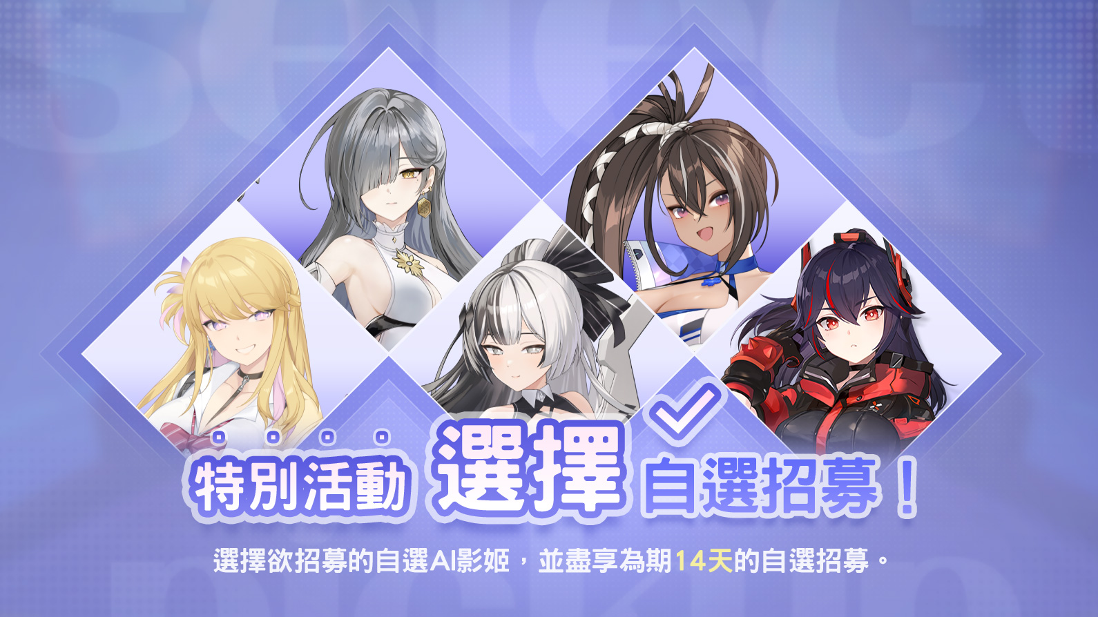 - 此自選招募活動可與其他自選招募活動同時進行。但,於活動期間重疊的自選招募活動中,將無法重複選擇相同的AI影姬。