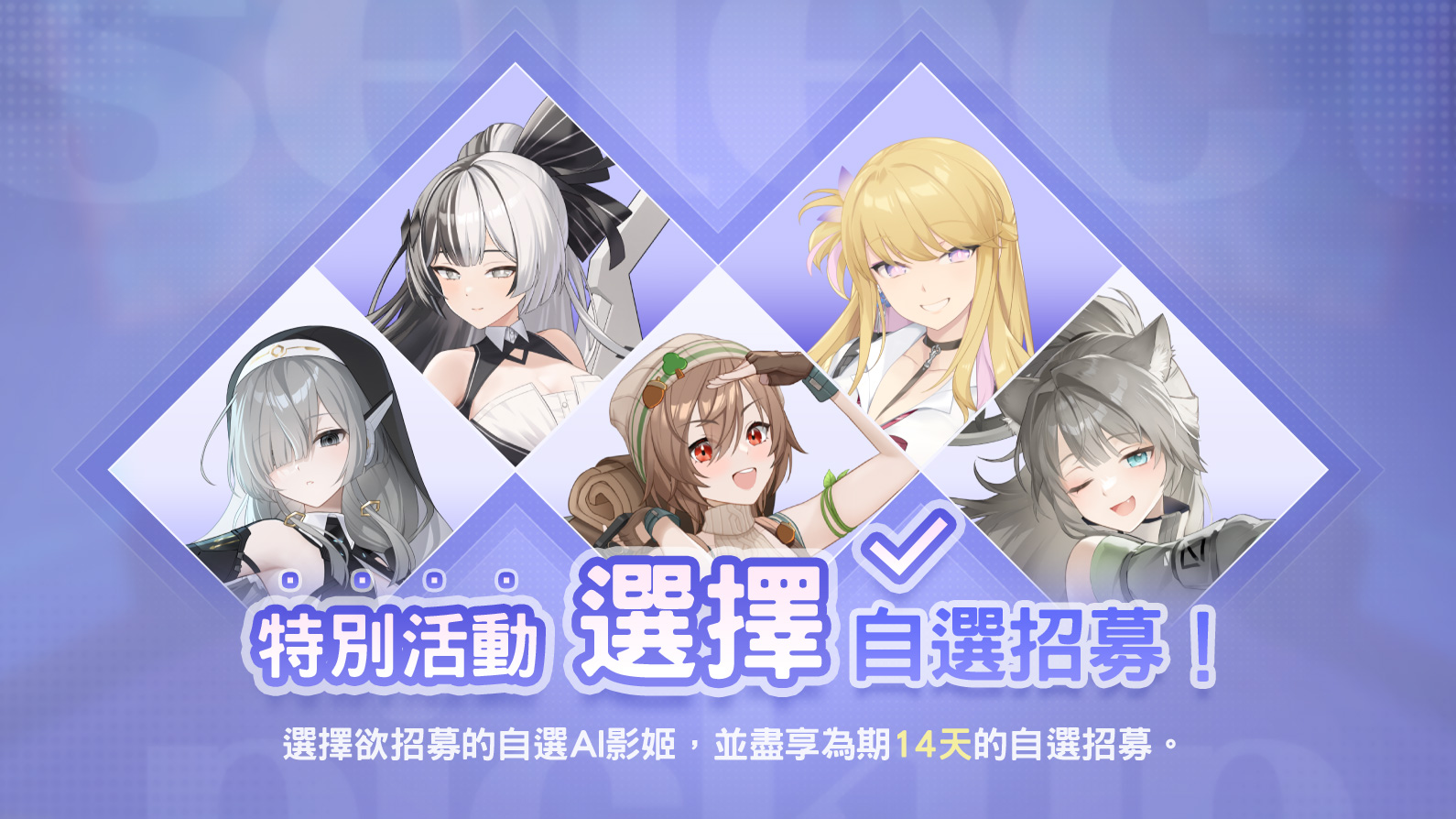 - 於活動期間,從5種自選招募對象AI影姬中選擇其中1種時,即可享為期14天的該AI影姬專屬自選招募。