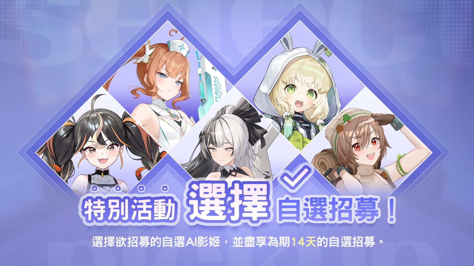 - 於活動期間,從5種自選招募對象AI影姬中選擇其中1種時,即可享為期14天的該AI影姬專屬自選招募。