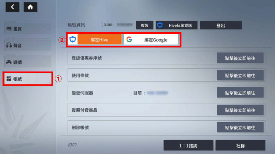 | 使用訪客帳號 | 若未與Google、Apple、Hive等進行帳號綁定,將無法進行帳號轉移。請務必於區域整合前完成綁定。