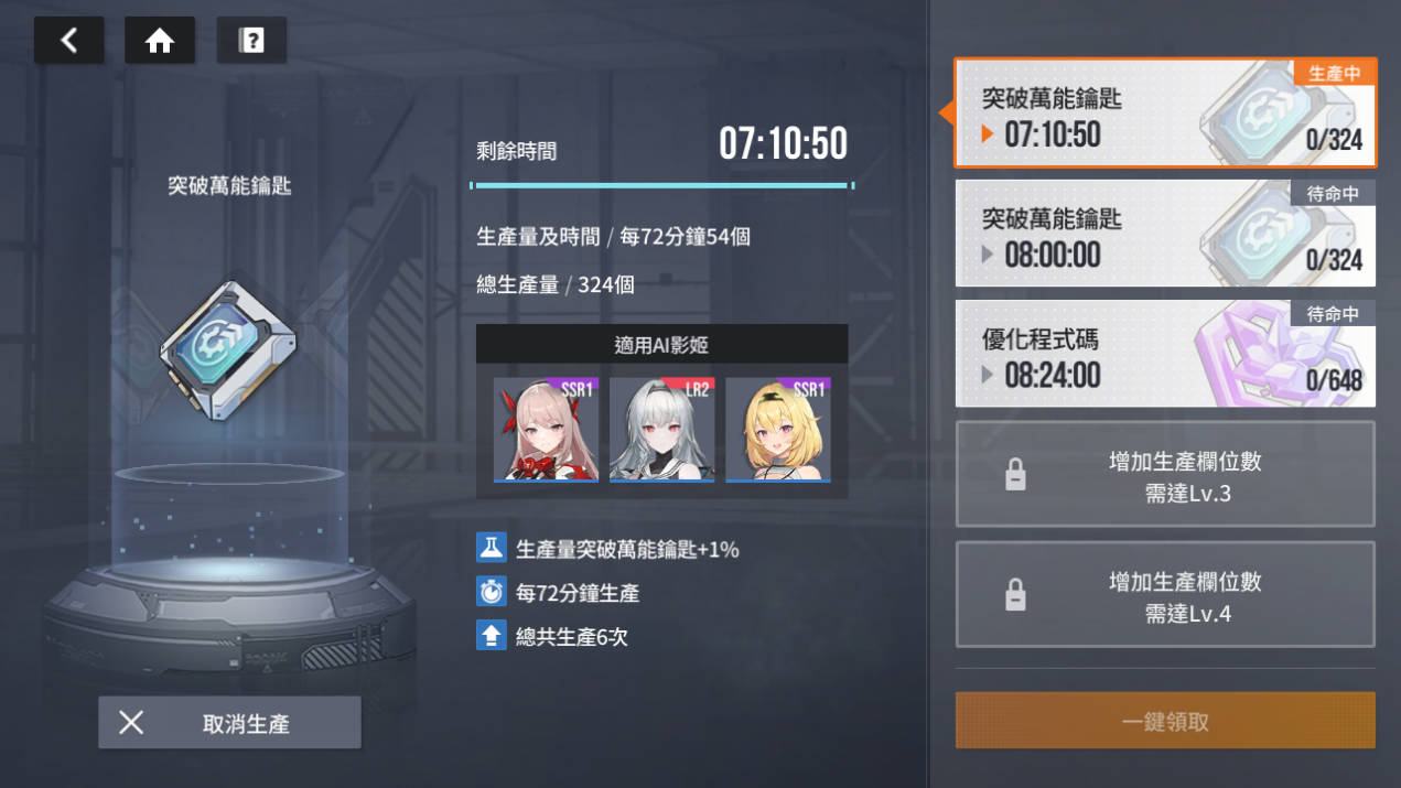 資源 無課建議全力生產突破萬能鑰匙 等級高了會非常缺