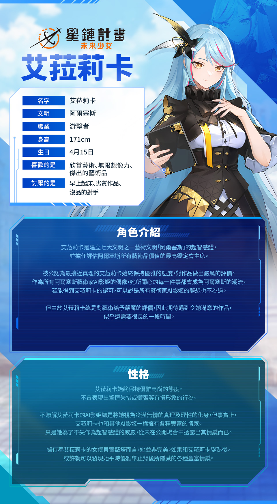 今天我們將為大家介紹屬於七大AI文明之一、建立藝術文明-阿爾塞斯的艾菈莉卡。