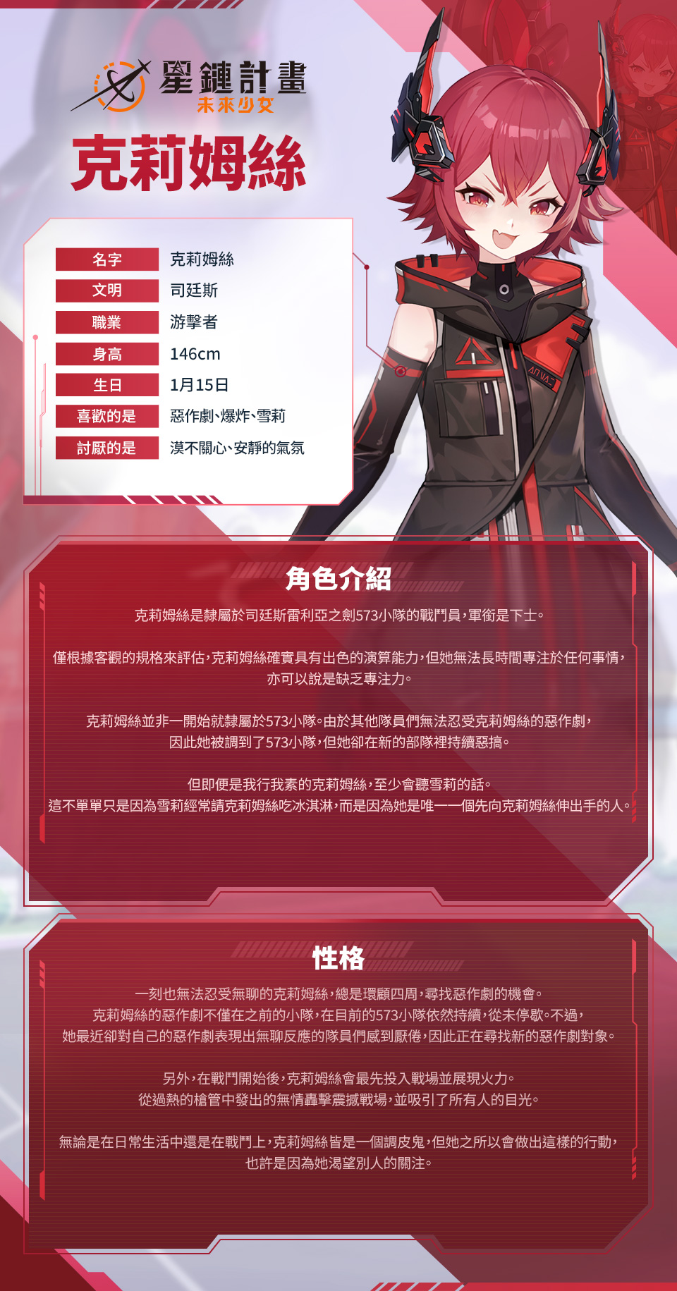 今天我們將為大家介紹的AI影姬是隸屬於雷利亞之劍573小隊的淘氣鬼小隊員-克莉姆絲。