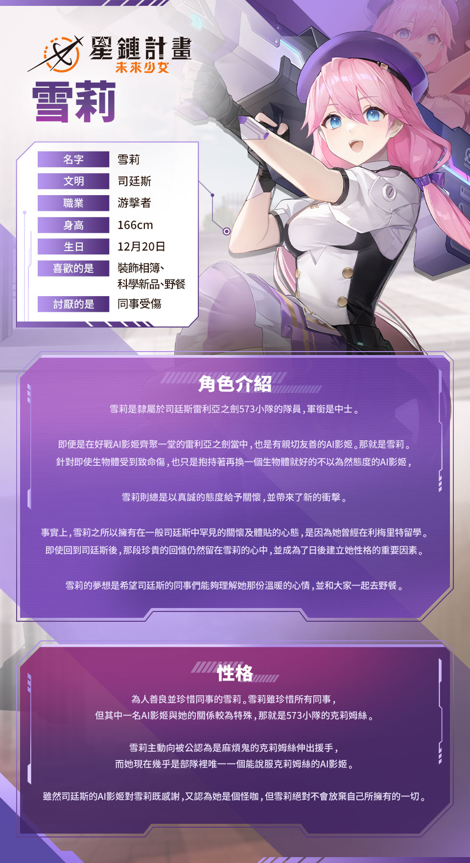 今天我們將為大家介紹的是隸屬於司廷斯雷利亞之劍573小隊的隊員雪莉!♡⸜(ˆᗜˆ˵ )⸝♡