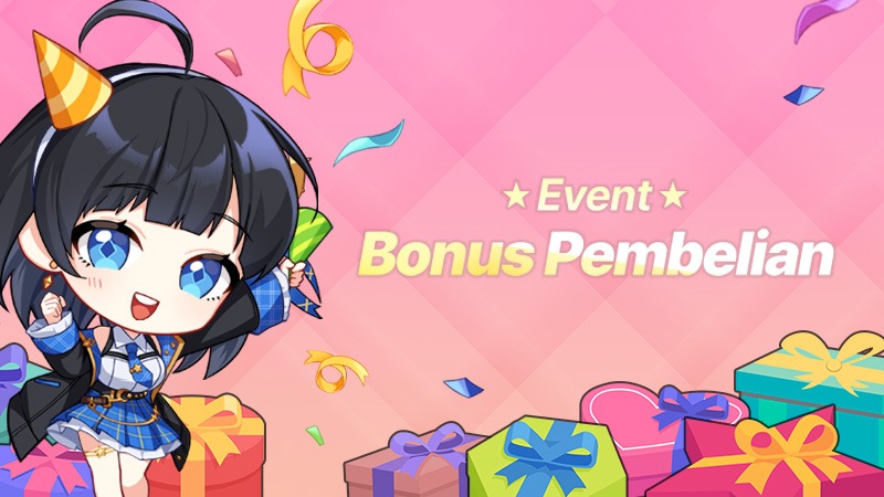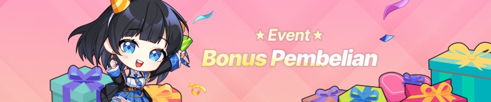 Event Bonus Pembelian telah dimulai. Selama periode ini, kamu bisa mendapatkan hadiah tambahan jika membeli produk pembayaran apa pun di Cash Shop.