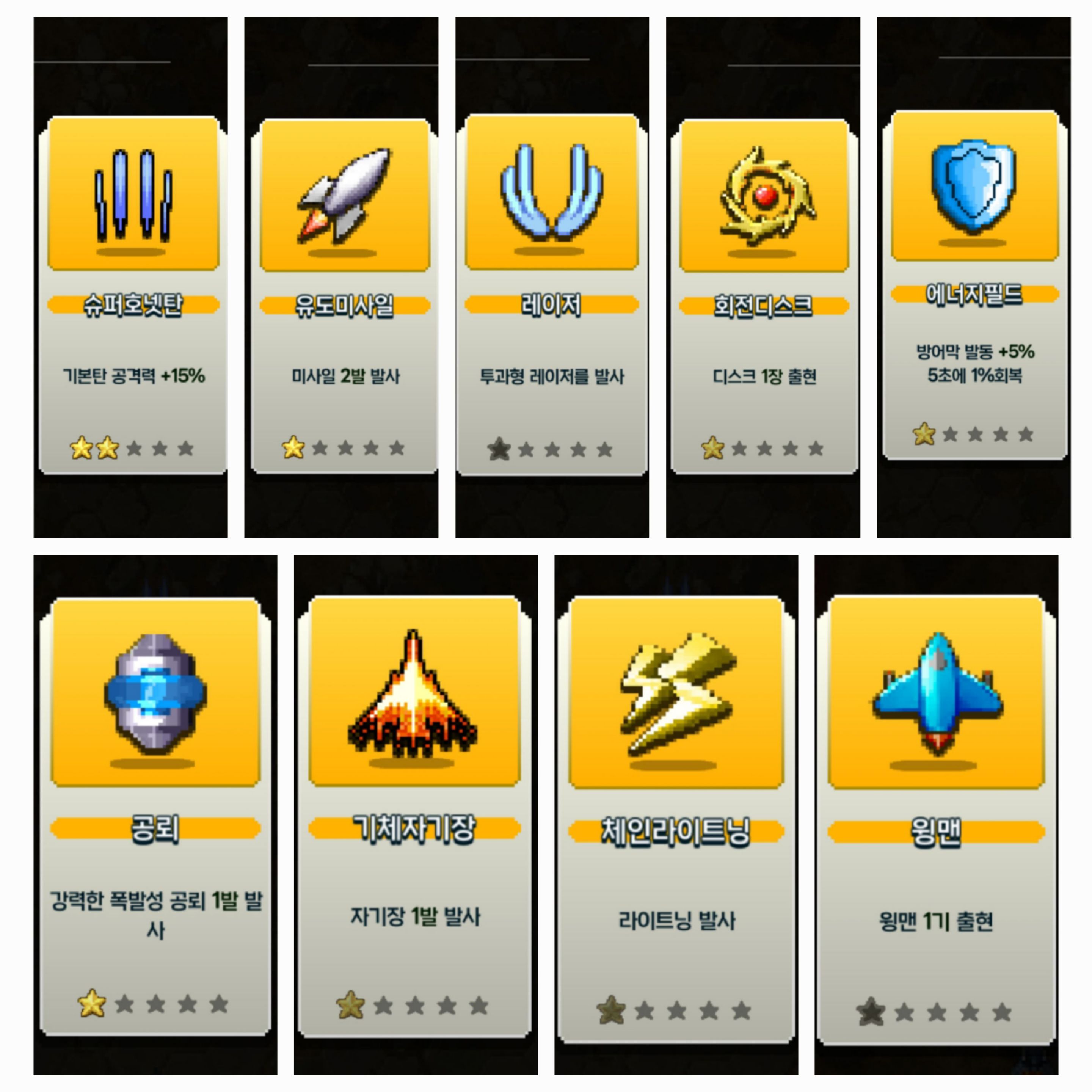 기본탄 / 레이저 / 유도탄 / 자기장 / 쉴드