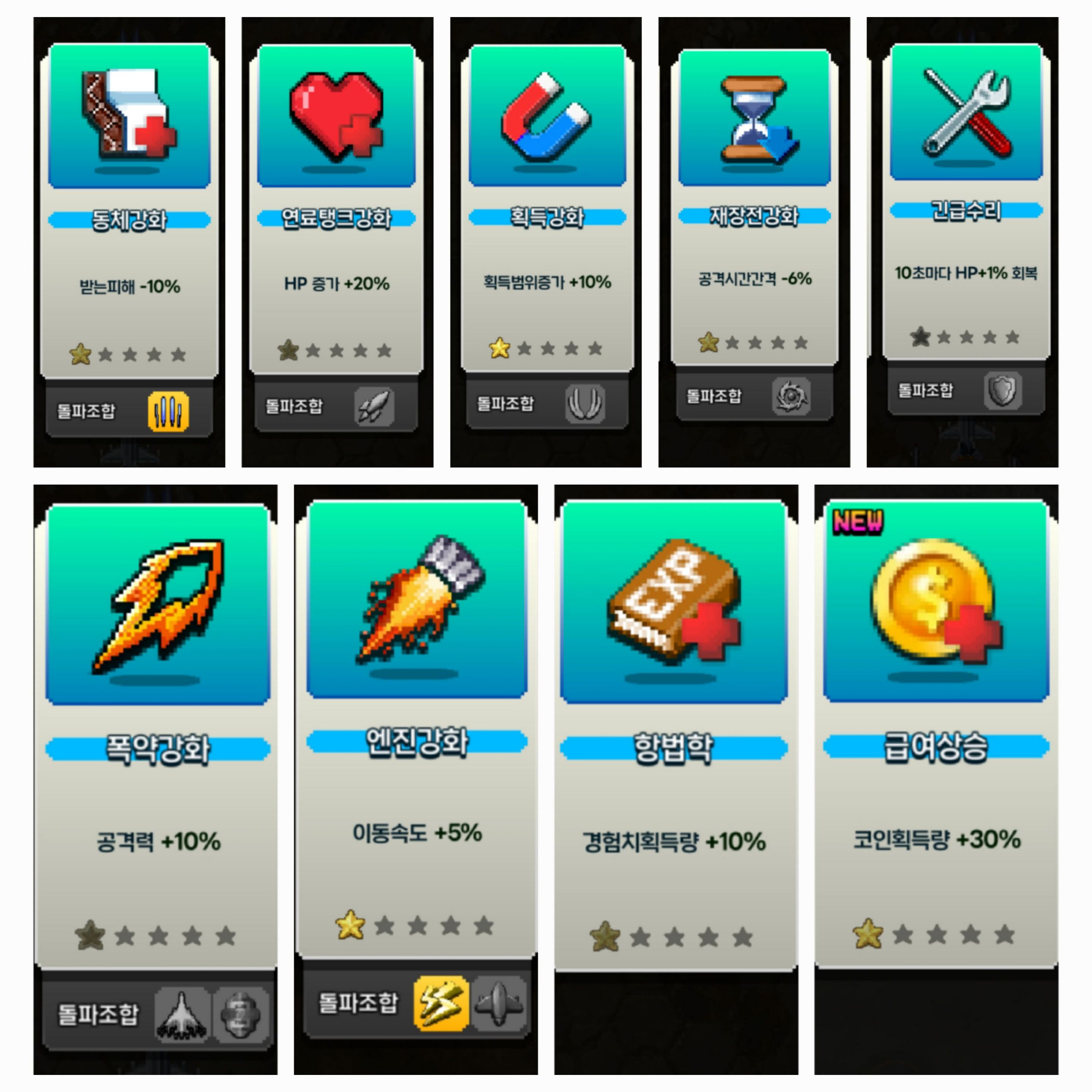 경험치 / 피해감소 / 체력증가
