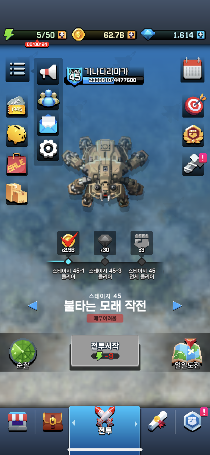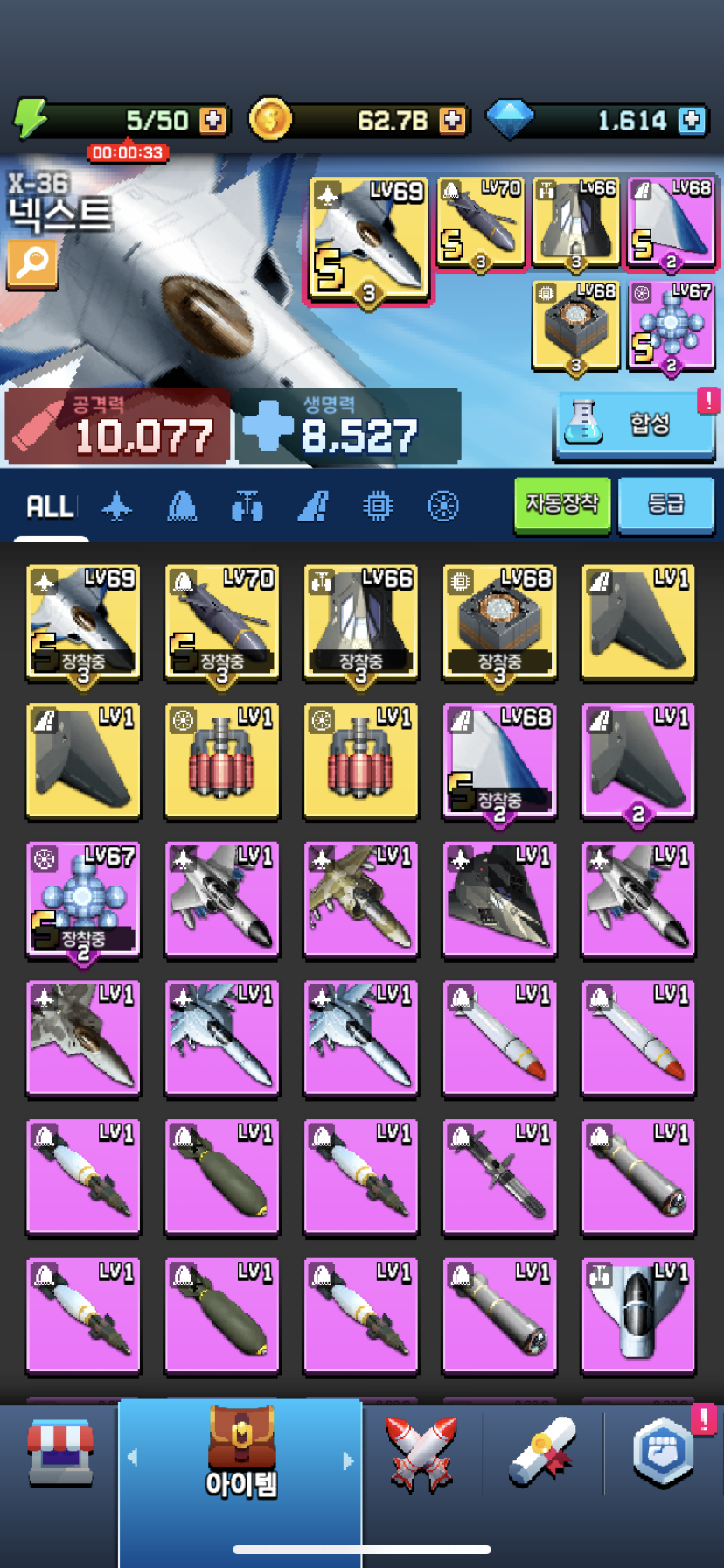 44스테이지 까지는 한두방에 통과됬는데 45스테이지 이넘은 공속. 공증. 공뢰. 자기장 풀로 채우고 때려도 꺼뜩도 안하네유. 에너지만 넉넉하면 여유있게 도전해보겠구만 한판에 9에너지 소모되니 그냥 속편하게 40스테이지에서 노가다만 해서 랩업이랑 장비업이나 해야겠네유. 45스테이 여기는 S장비 풀셋차면 충분할거 같네유. 다들 홧팅하실게유~~