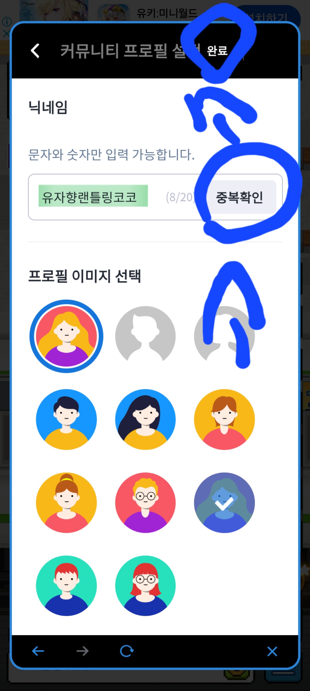 사용 가능한 닉네임이라 뜬다면 위에 완료를 눌러주세요.