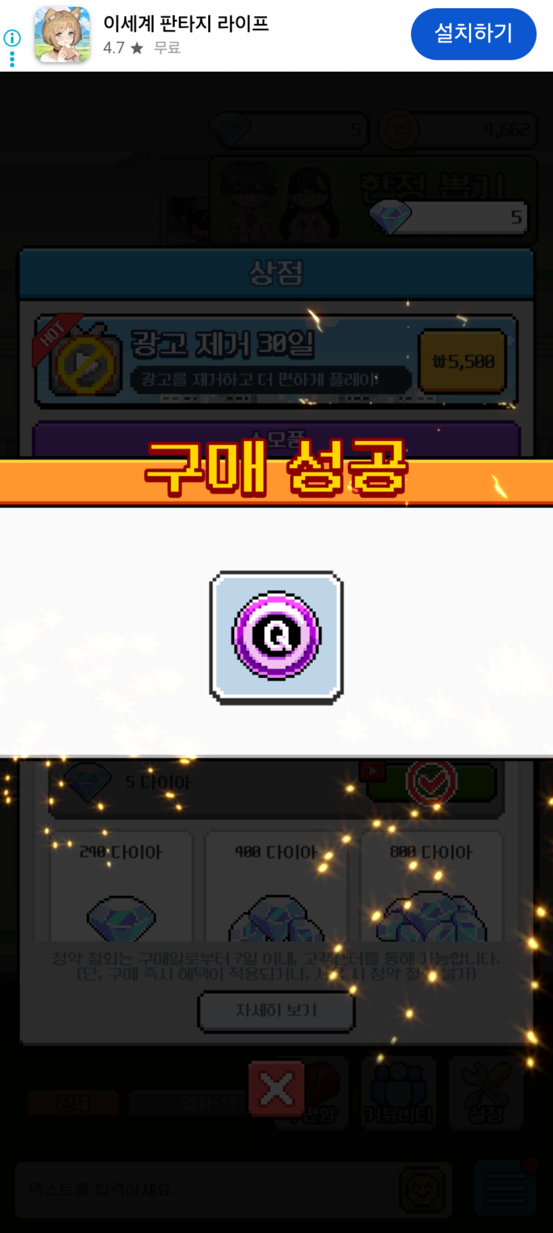퀘스트 2배 짜리를 돈이 없어 구입 못하는데, 갑자기 “구매 성공”이 떠서 버그가 걸렸습니다.