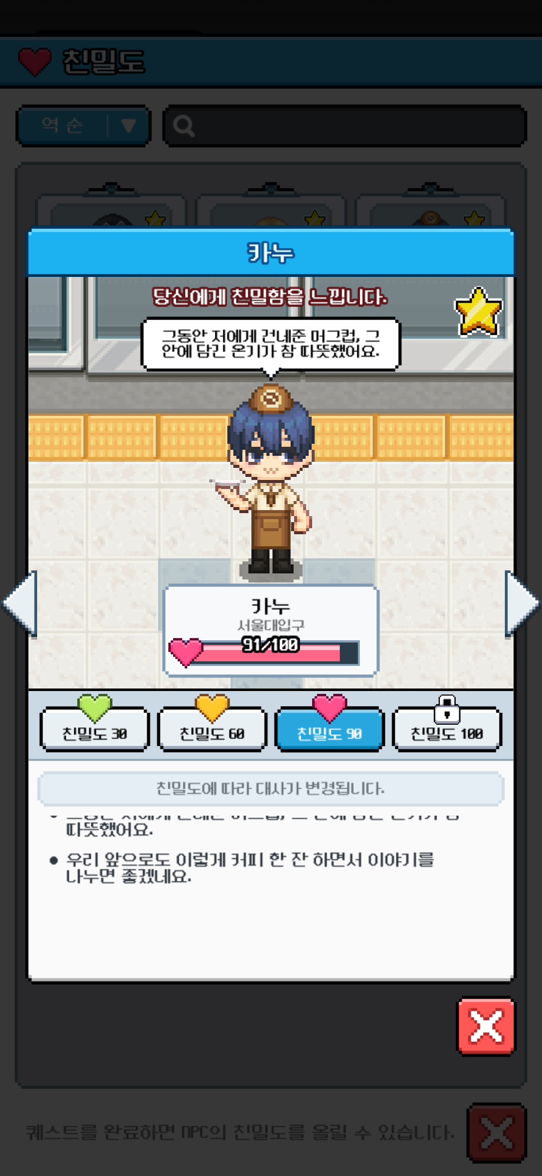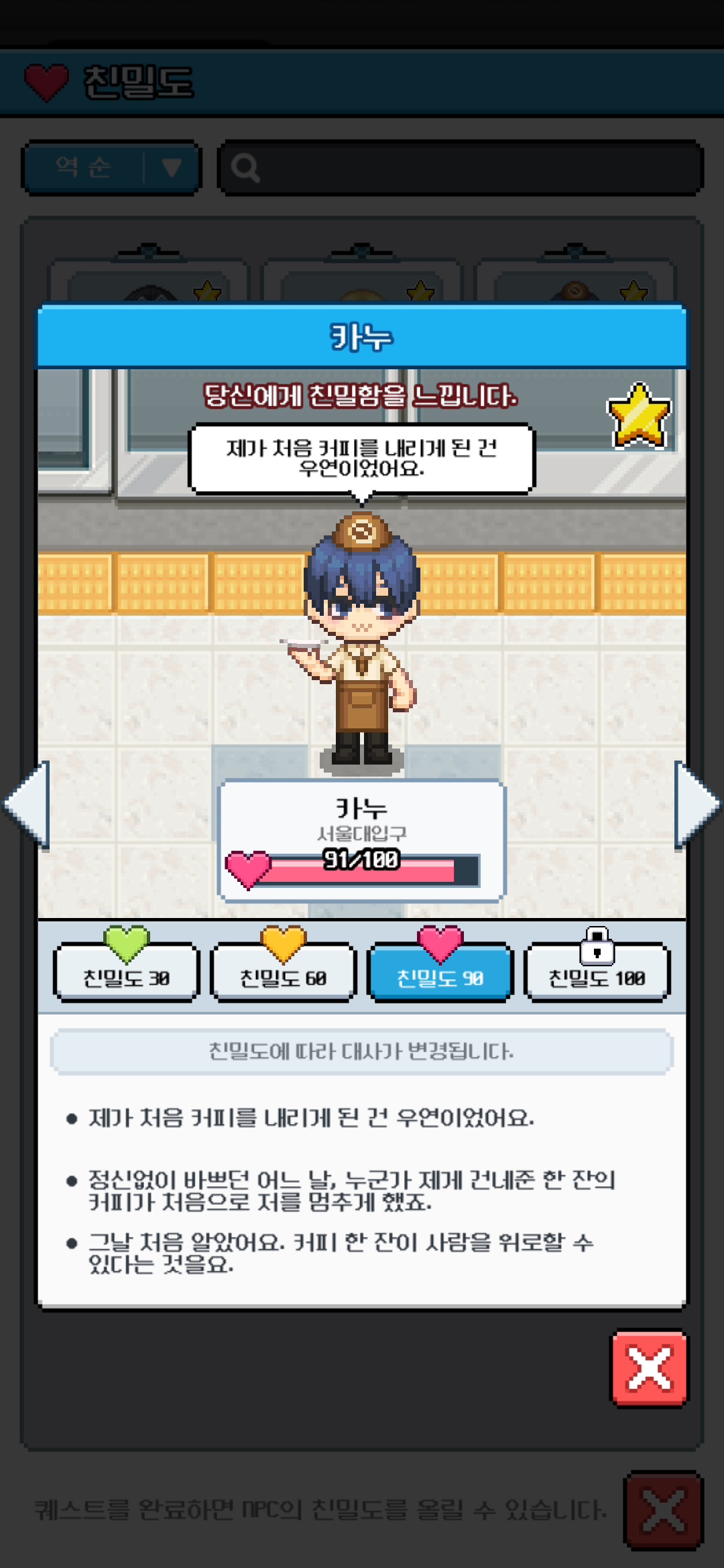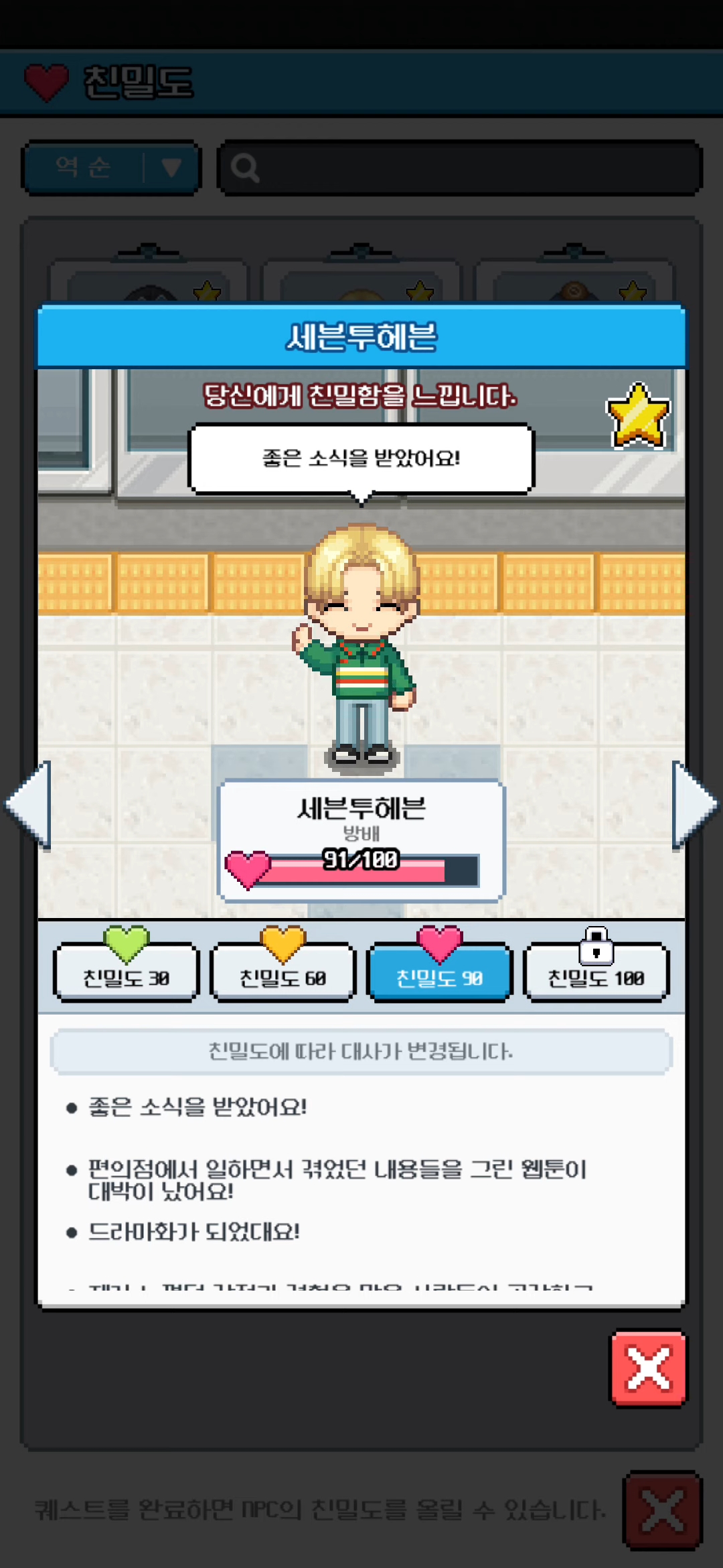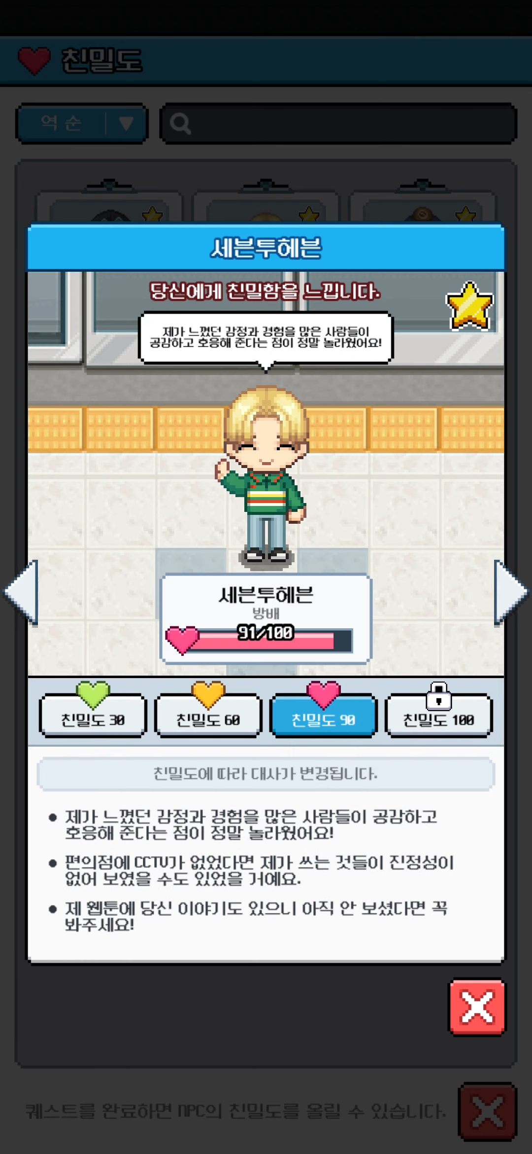 NPC 3명 친밀도 100 채웠습니다! :) (세븐투헤븐 친밀도 90 추가)