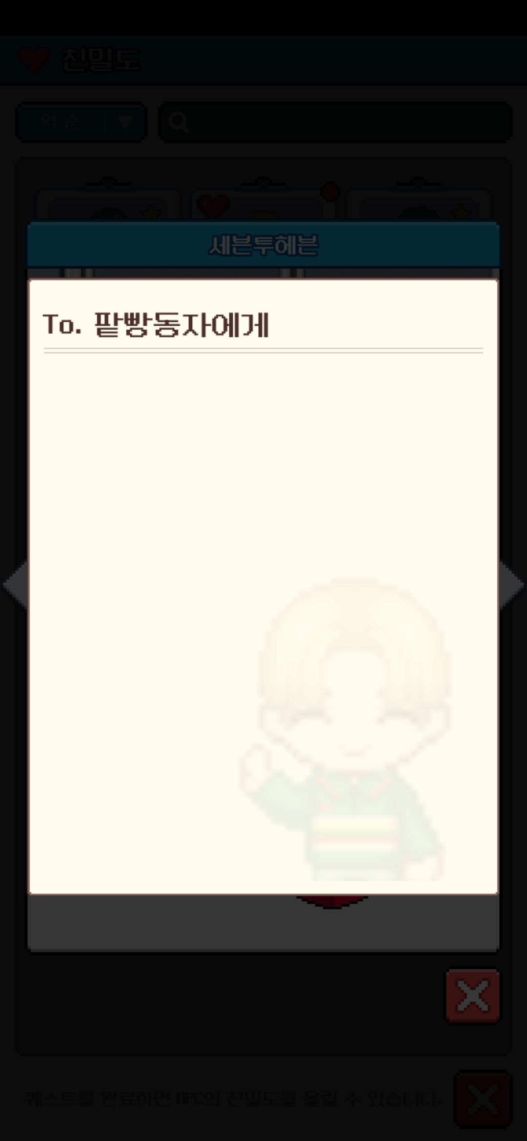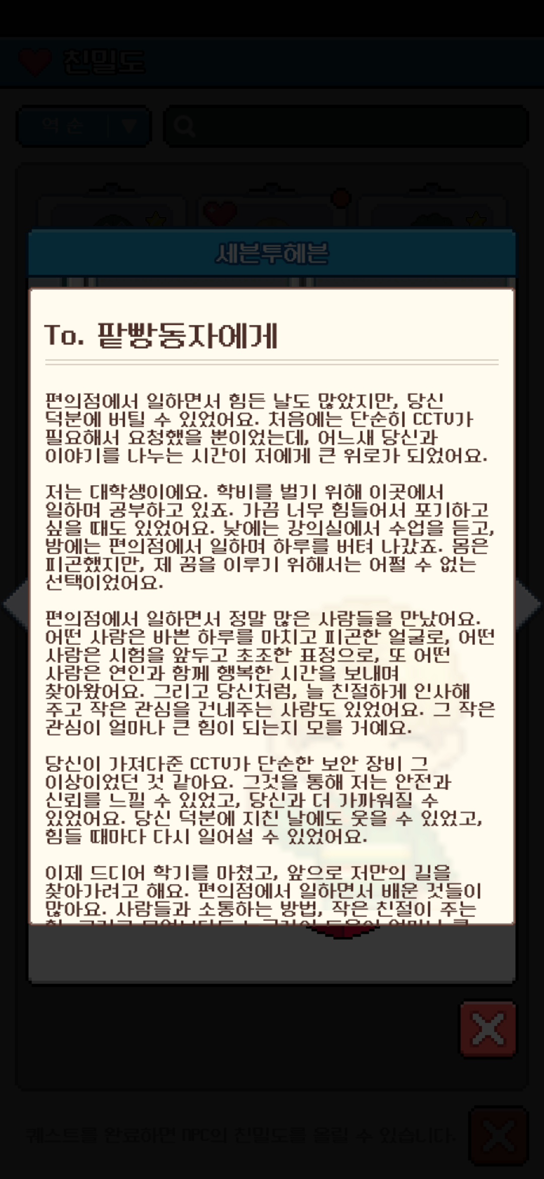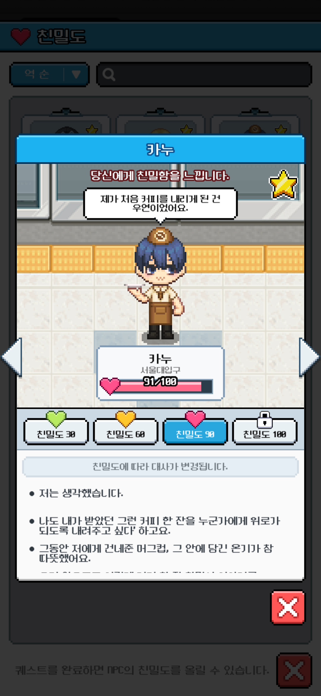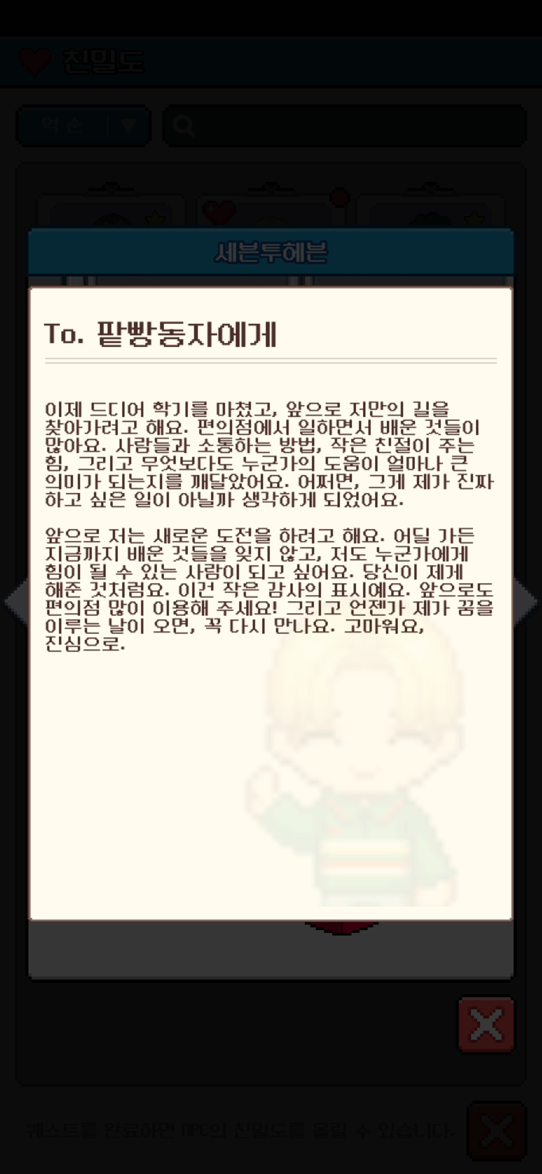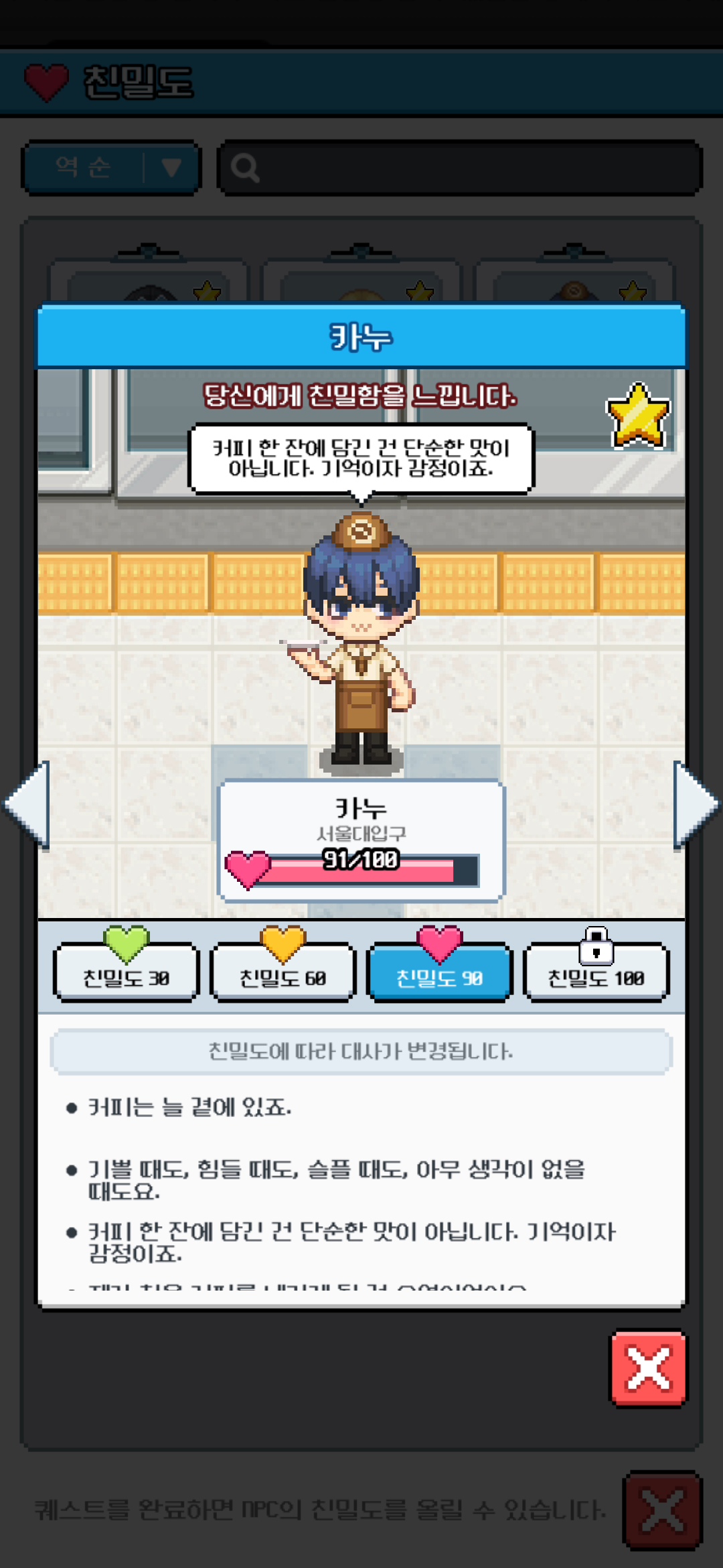 NPC 3명 친밀도 100 채웠습니다! :) (세븐투헤븐 친밀도 90 추가)