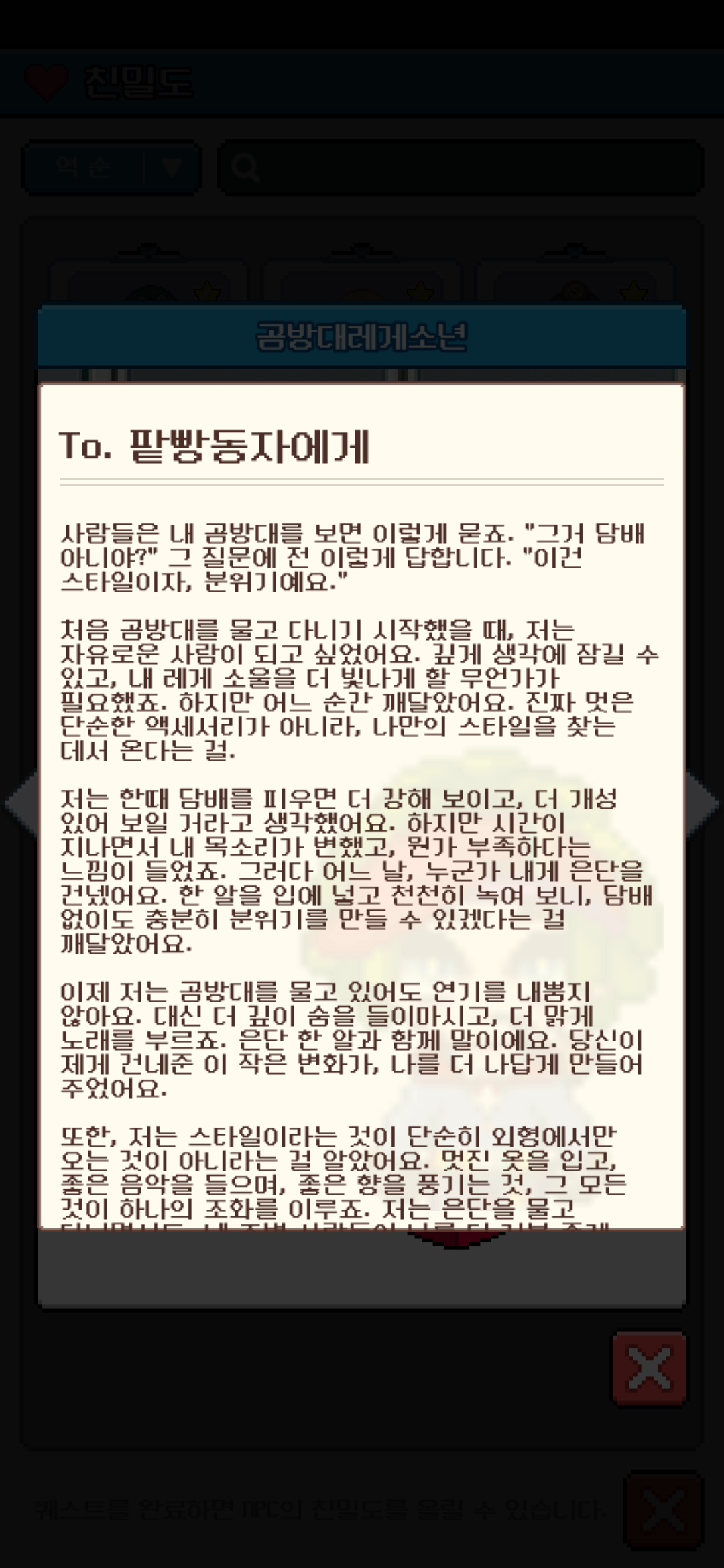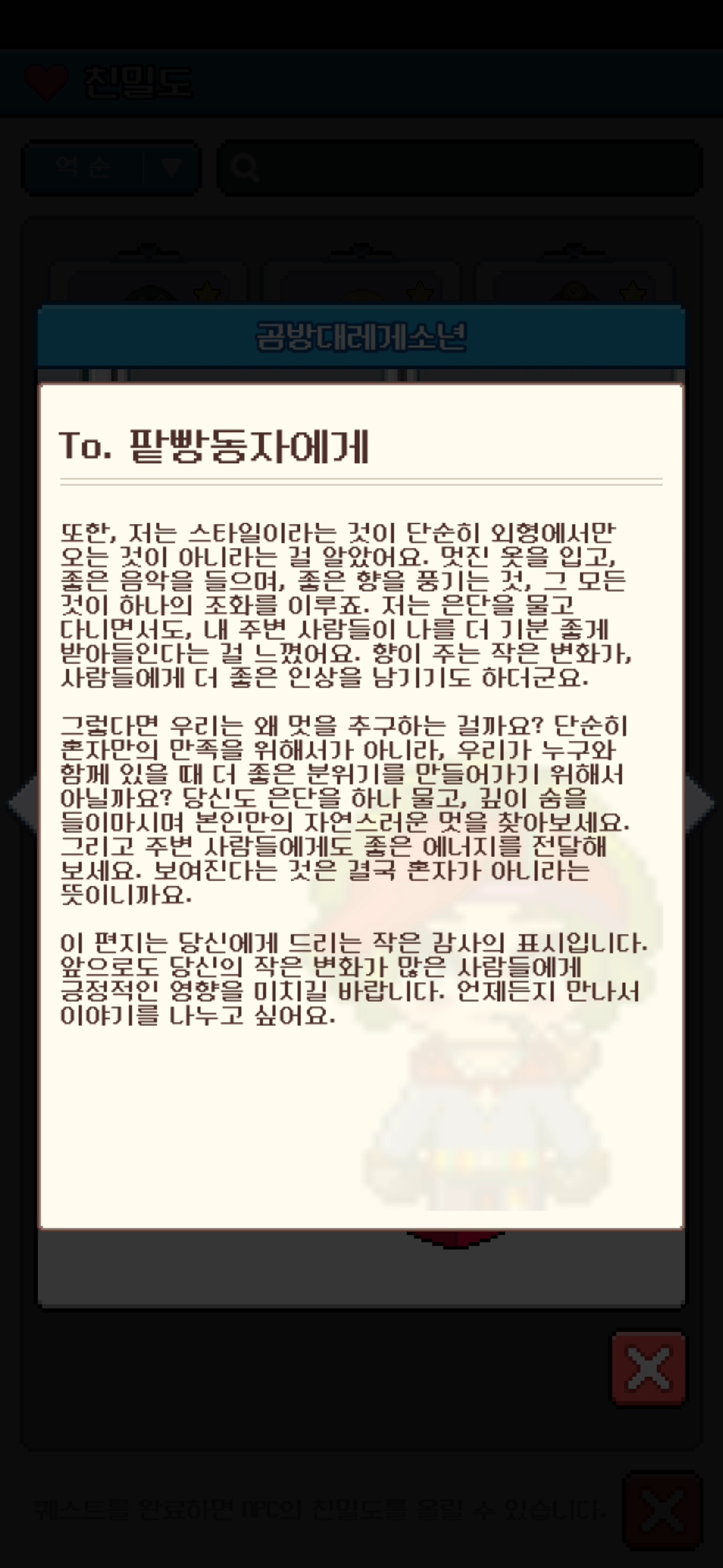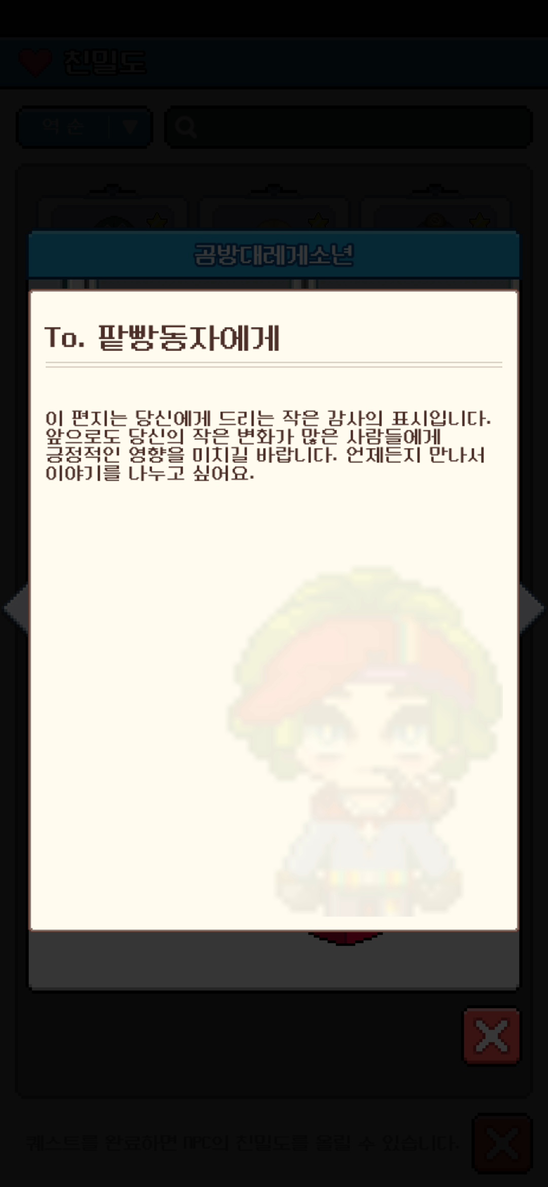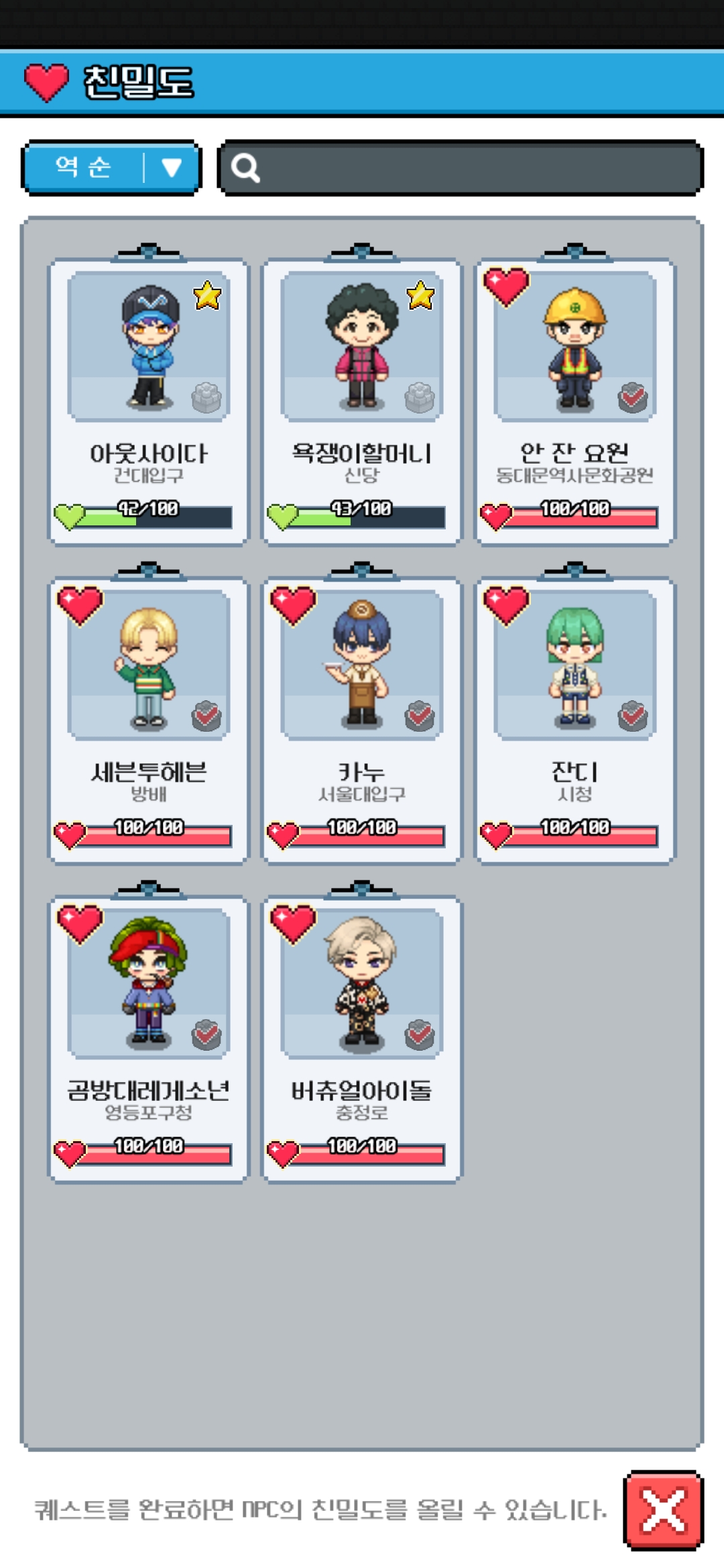 이제 아웃사이다와 욕쟁이 할머니의 친밀도 100채우기만 하면 됩니다. :)