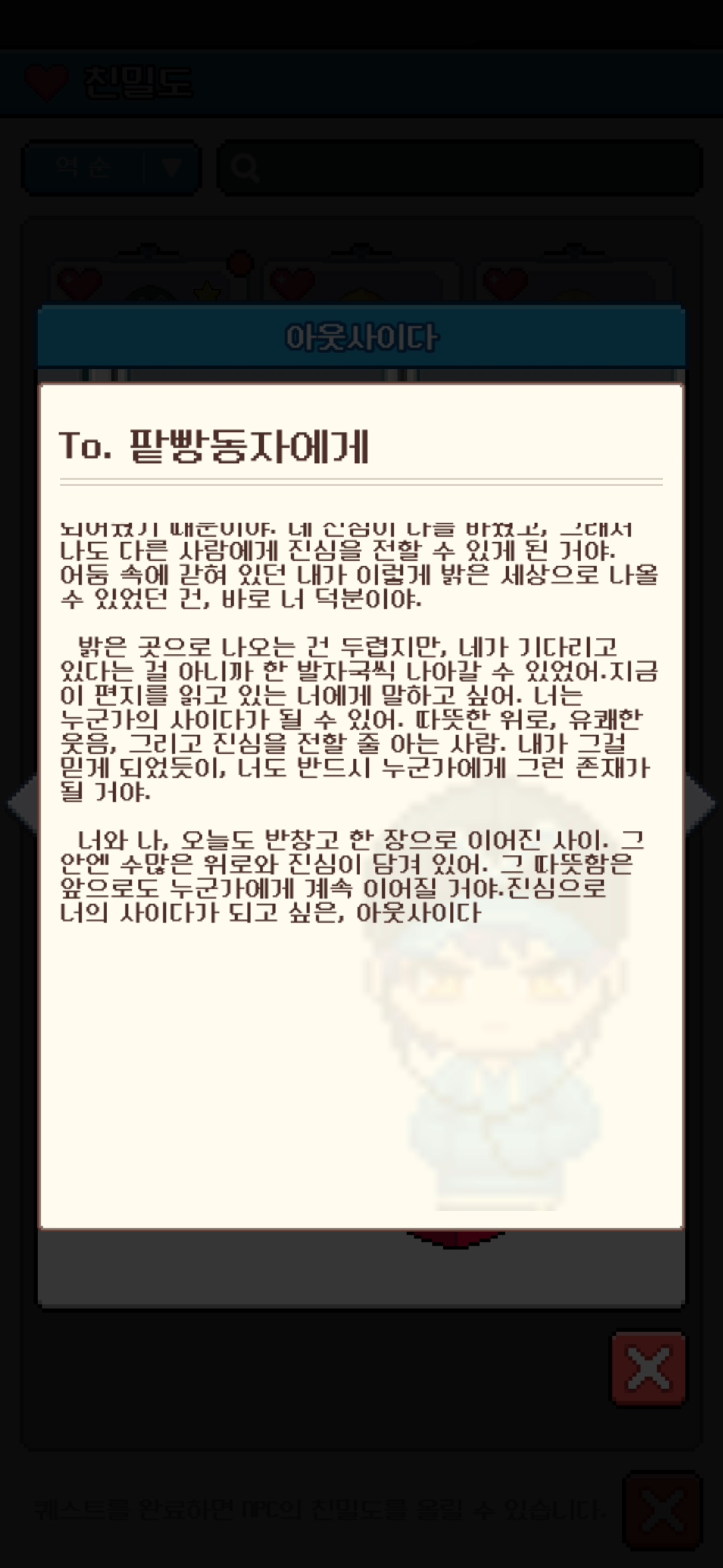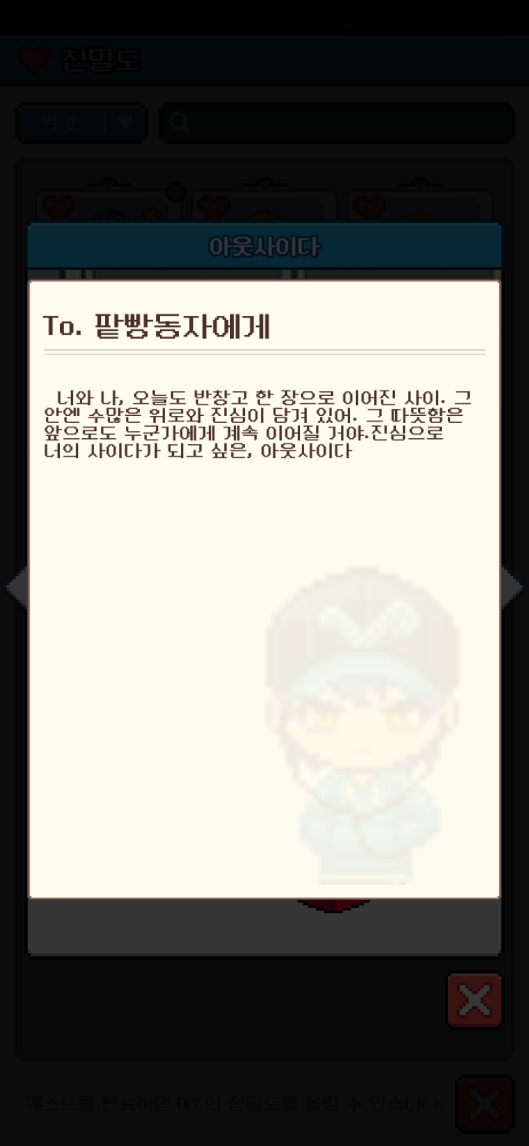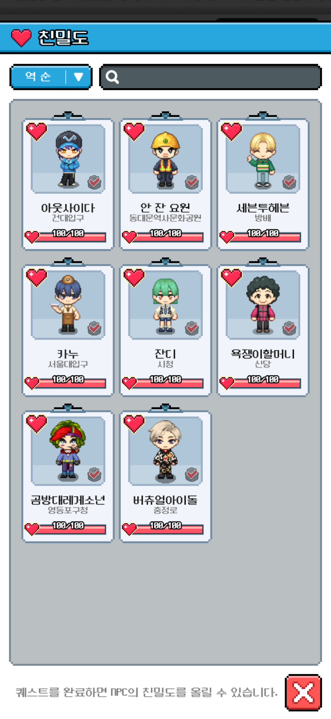 8명의 NPC 친밀도 모두 100 달성 완료입니다! :)