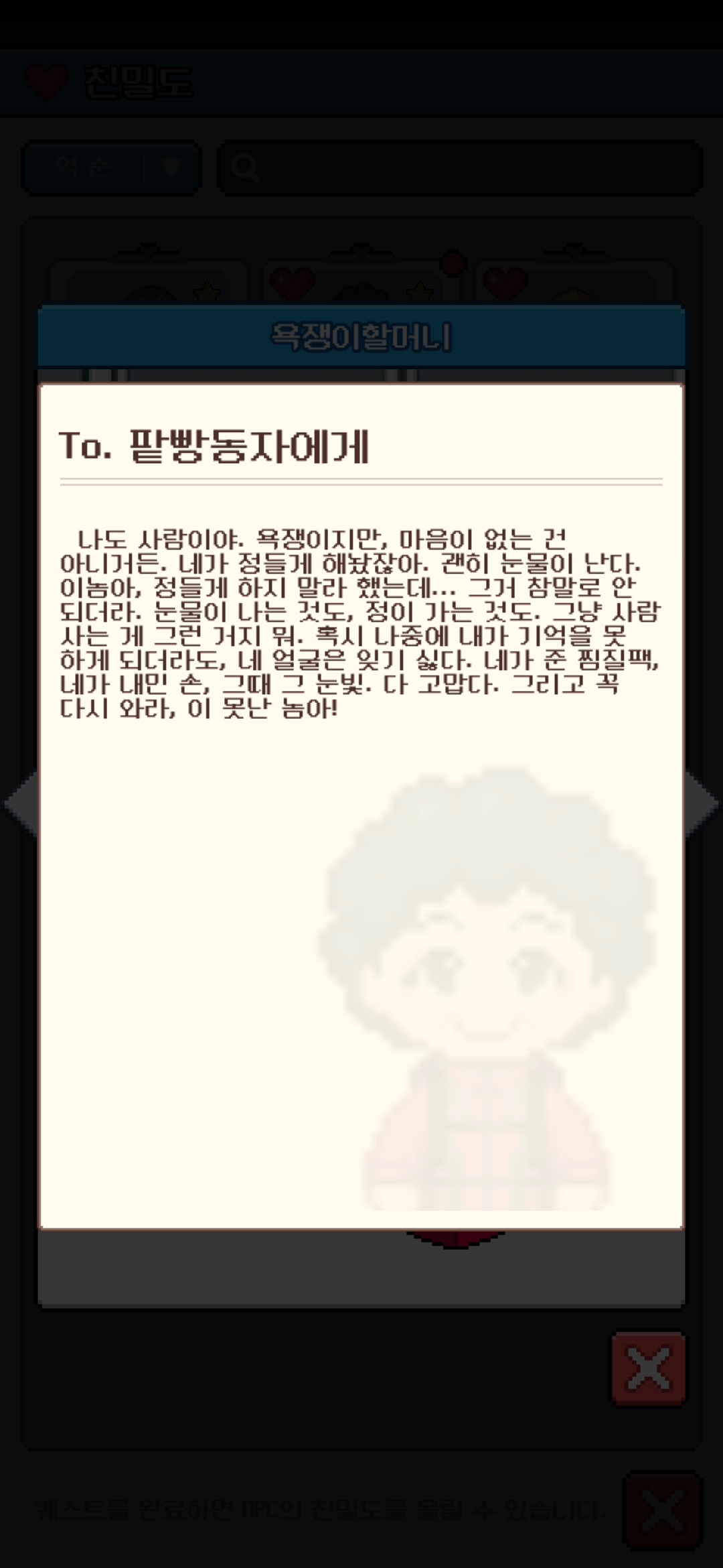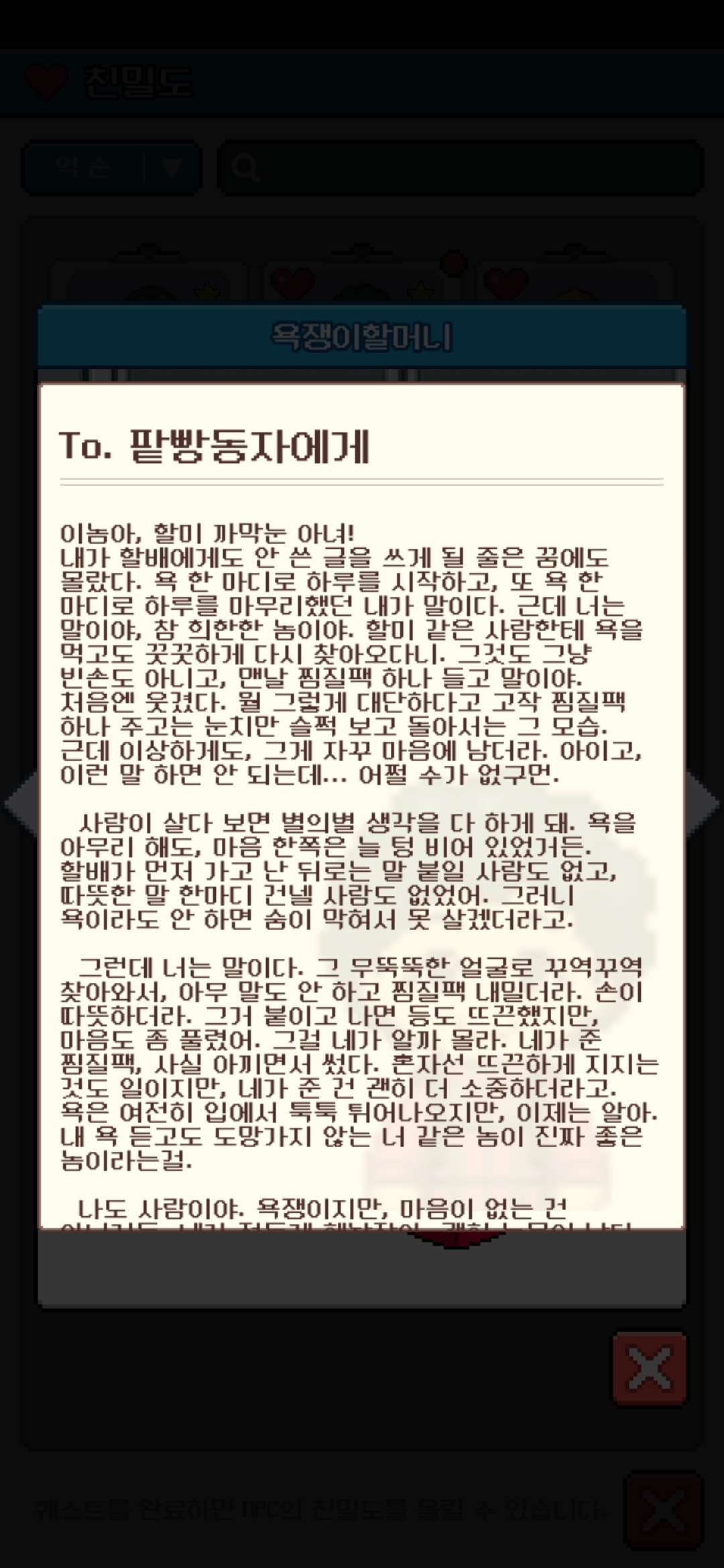 욕쟁이 할머니의 친밀도 100 달성입니다. :)