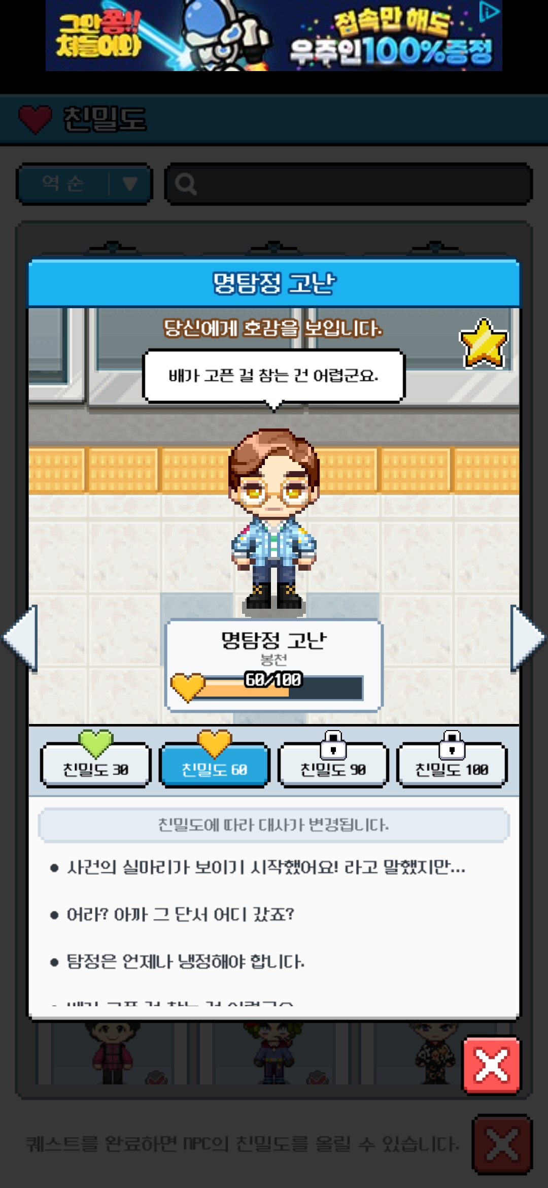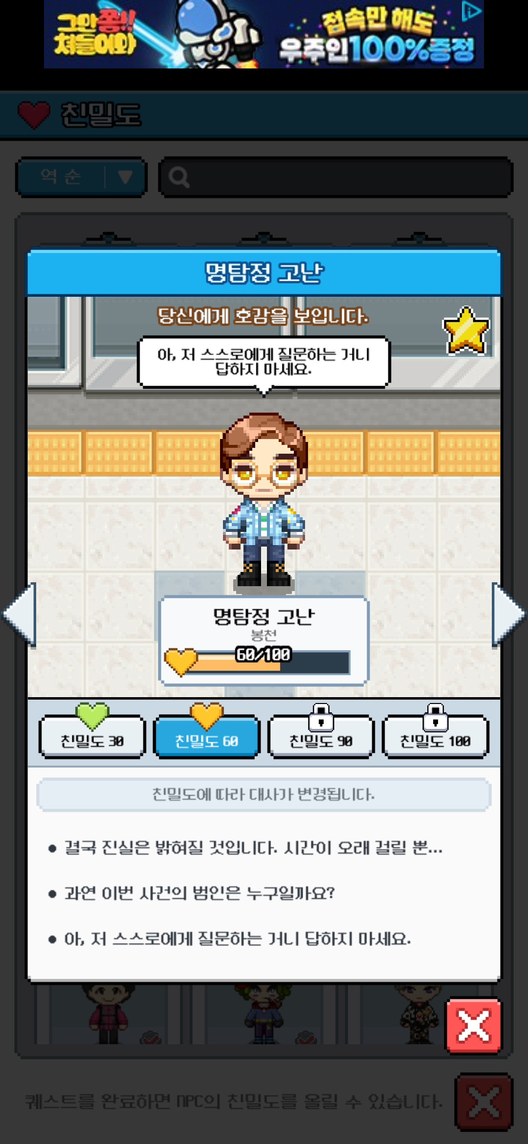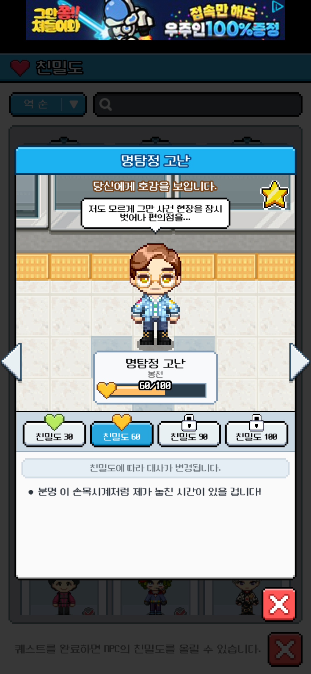 💬자유 게시판 명탐정 고난과 첩보요원 친밀도 60달성입니다! :) 팥빵동자 2025-05-27 01:42 67 1 공유 공유 URL 복사 페이스북 왓츠앱 카카오톡 라인 레딧 닫기 공유 3 0 댓글 1 삭제 이미지첨부 0/3000 등록