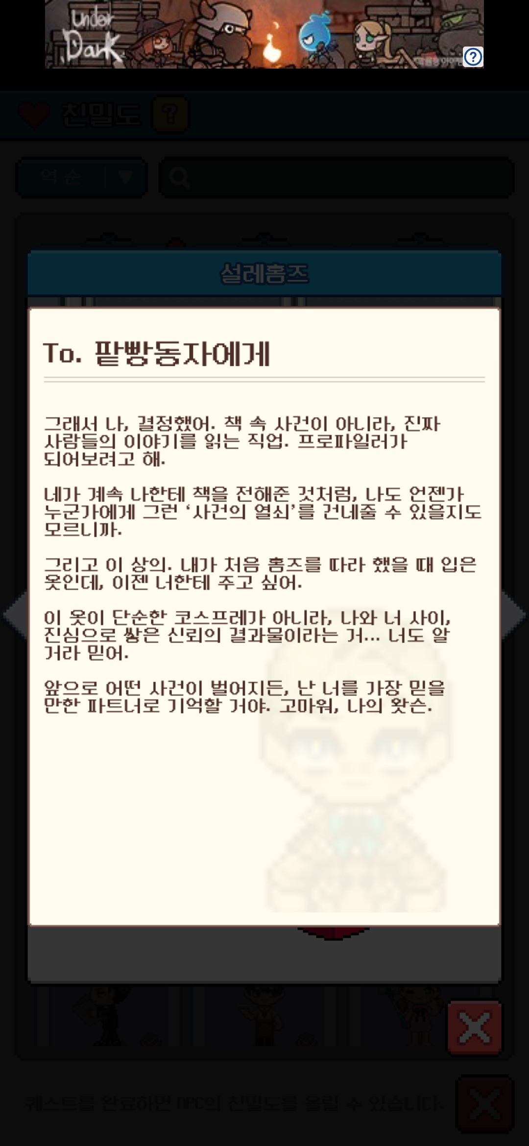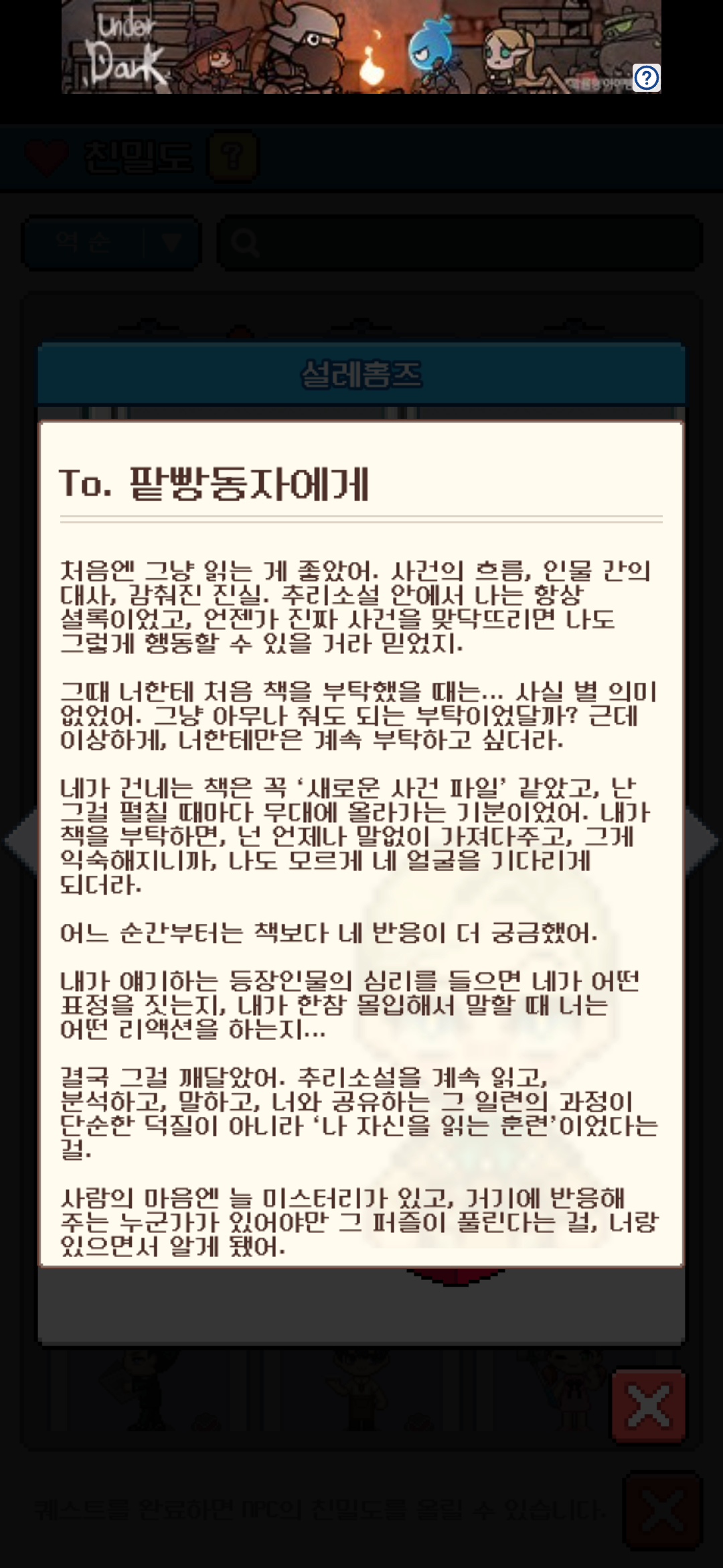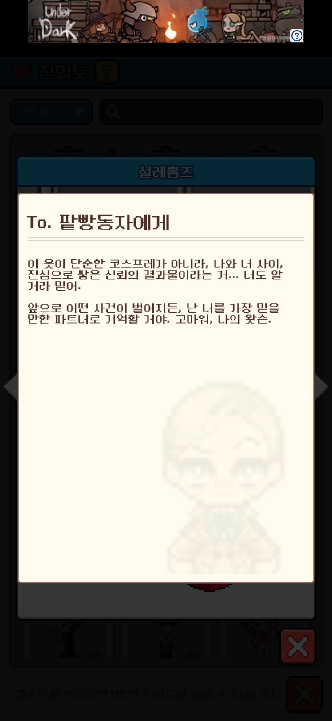 💬자유 게시판 설레홈즈 친밀도 100달성입니다! :) 팥빵동자 2025-06-21 01:56 88 1 공유 공유 URL 복사 페이스북 왓츠앱 카카오톡 라인 레딧 닫기 공유 1 0 댓글 1 삭제 이미지첨부 0/3000 등록