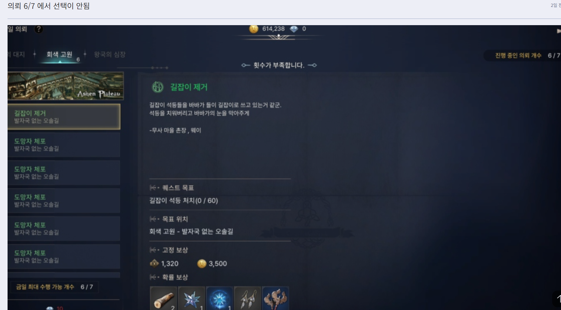 아니 1일차 의뢰 6/7 에서 선택 안된다고 문의 했는데 답변도 없고 보상도 없고 ㅡㅡ