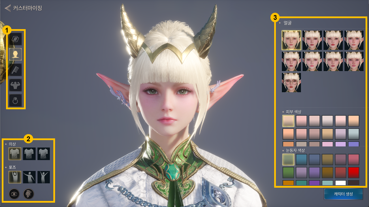 - - 캐릭터의 의상, 포즈, 시선, 투구 착용 유무를 변경할 수 있습니다.