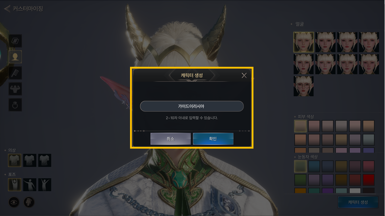 - 캐릭터 외형을 선택 후 [캐릭터 생성] 버튼을 누르면 캐릭터 이름을 입력할 수 있으며, 이름 입력 후 확인 버튼을 누르면 캐릭터 생성이 완료됩니다.