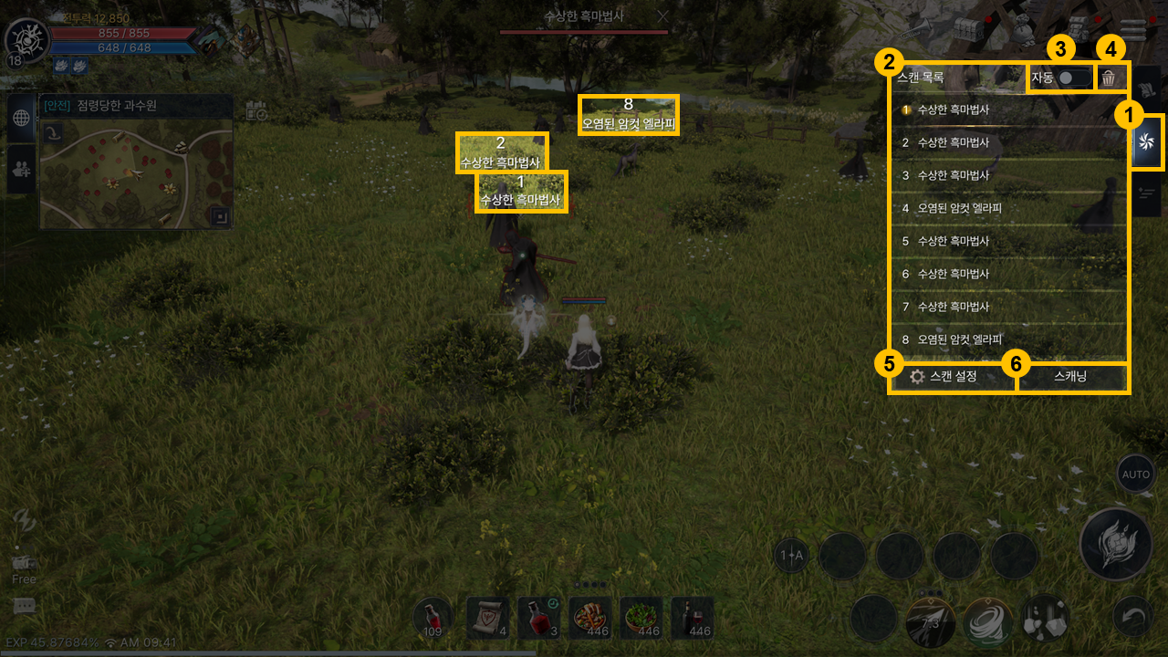 스캔은 주변의 몬스터와 유저를 탐색할 수 있는 기능입니다.