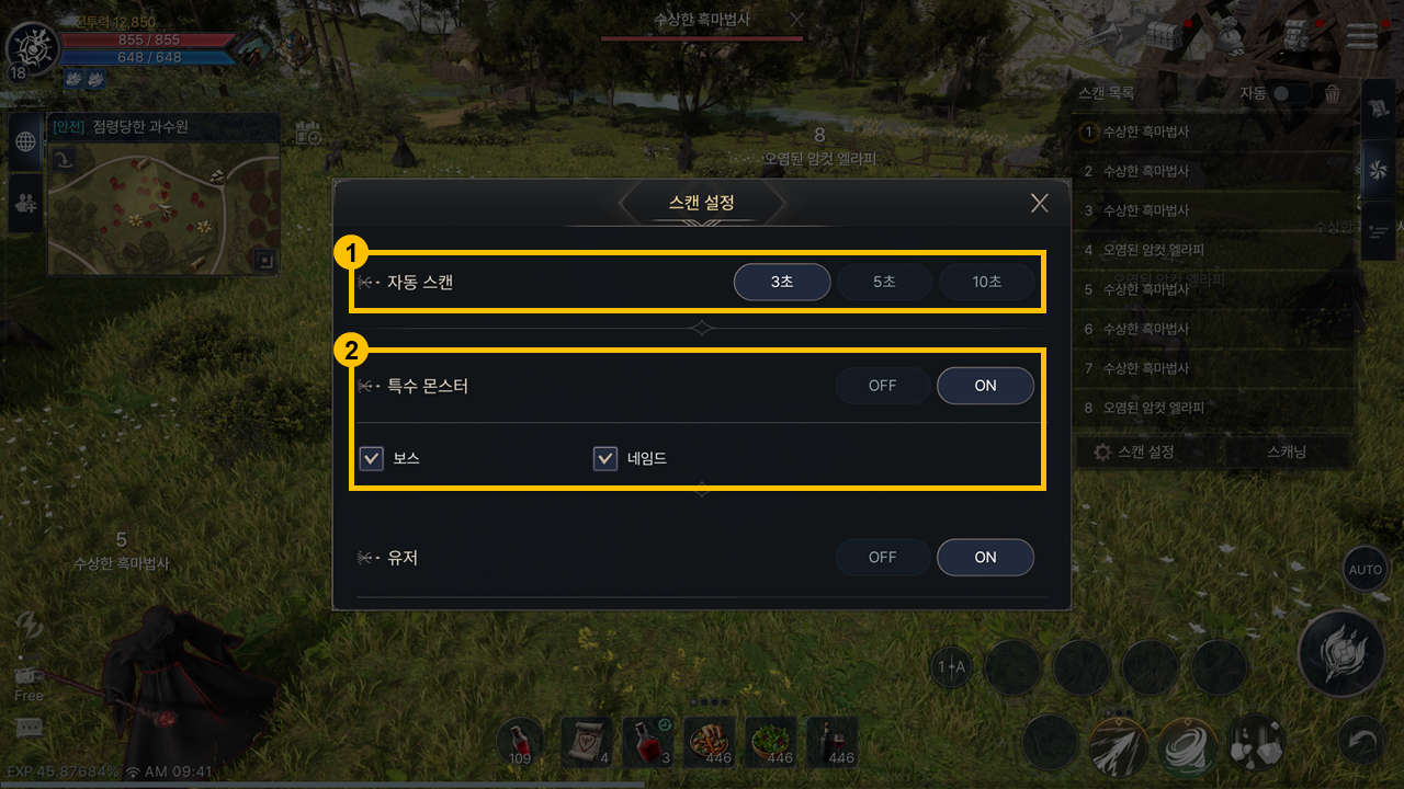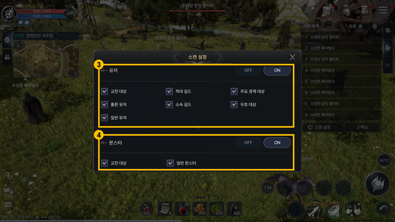 - 스캔 설정에서는 자동 스캔 간격과 몬스터/유저 스캔 포함 여부를 조건 별로 상세하게 설정할 수 있습니다.