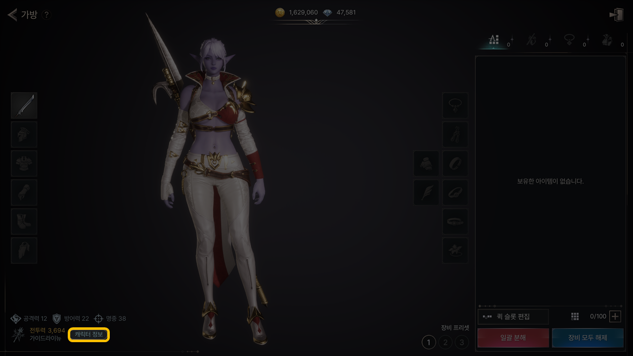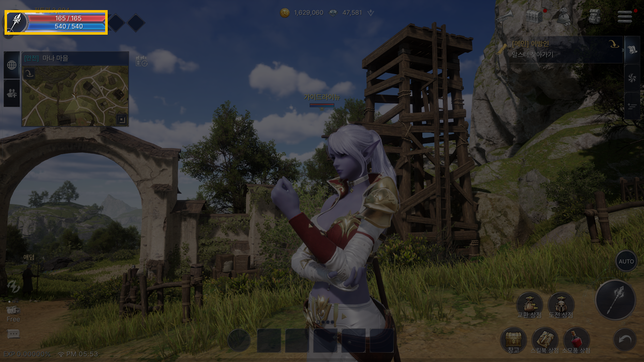 - 메인 화면 왼쪽 위의 클래스 아이콘, HP 및 MP를 클릭하거나, 가방 왼쪽 아래 캐릭터 정보 버튼을 클릭하면 캐릭터 정보 화면이 표시됩니다