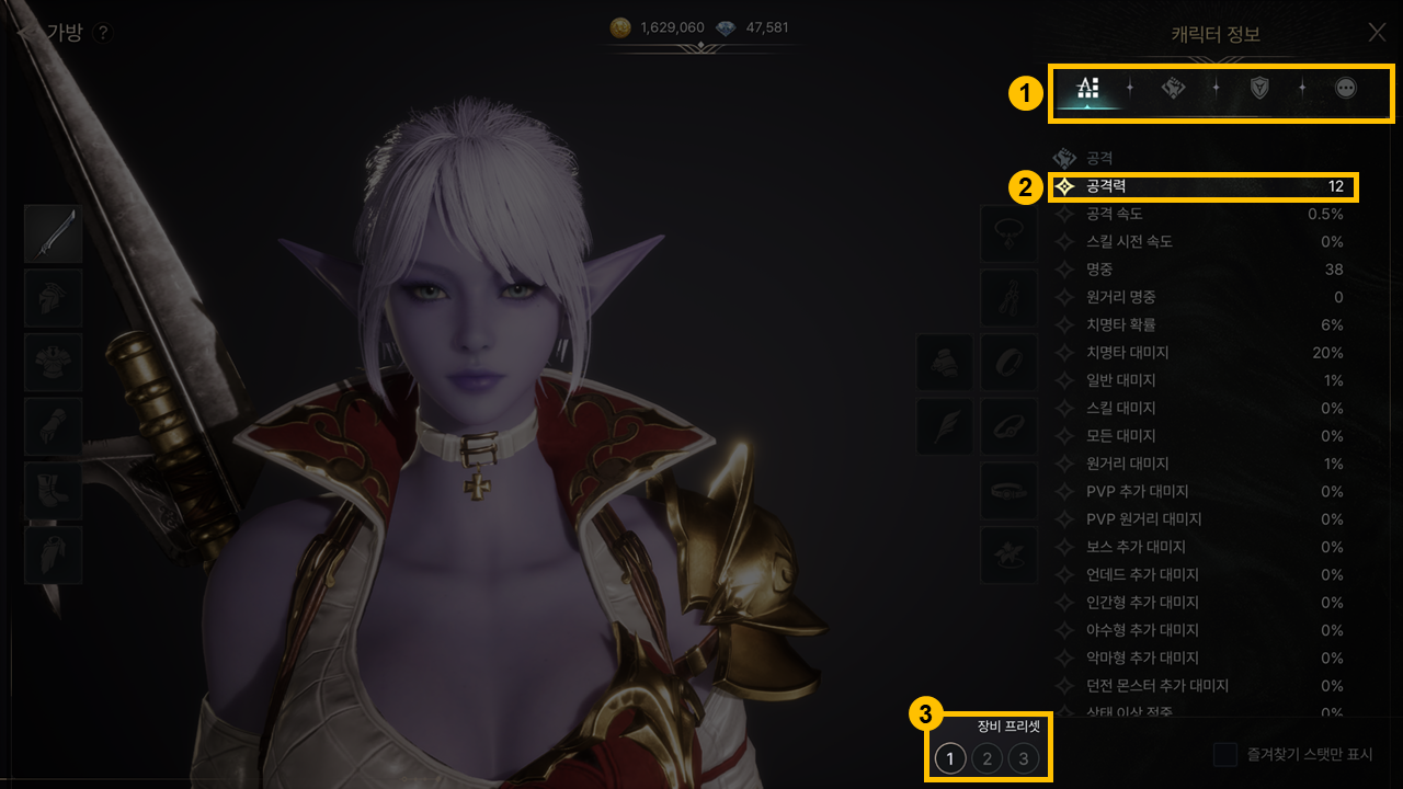 - - 장비 프리셋을 1, 2, 3번으로 지정하여 한 번에 교체할 수 있습니다.