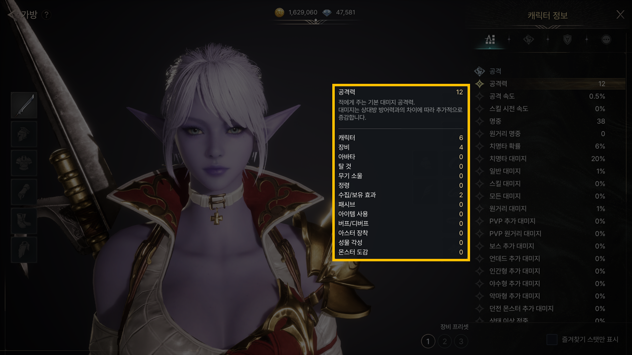 캐릭터 정보에서는 현재 접속한 캐릭터의 상세 정보를 확인할 수 있습니다.